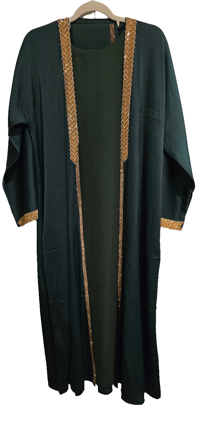 Expertly crafted with exquisite detailing, this 4-Piece Abaya Set will elevate your style effortlessly. The set features delicately placed cut dana and stone work, adding a touch of elegance to your look. Perfect for special occasions or everyday wear, this set offers both sophistication and versatility.