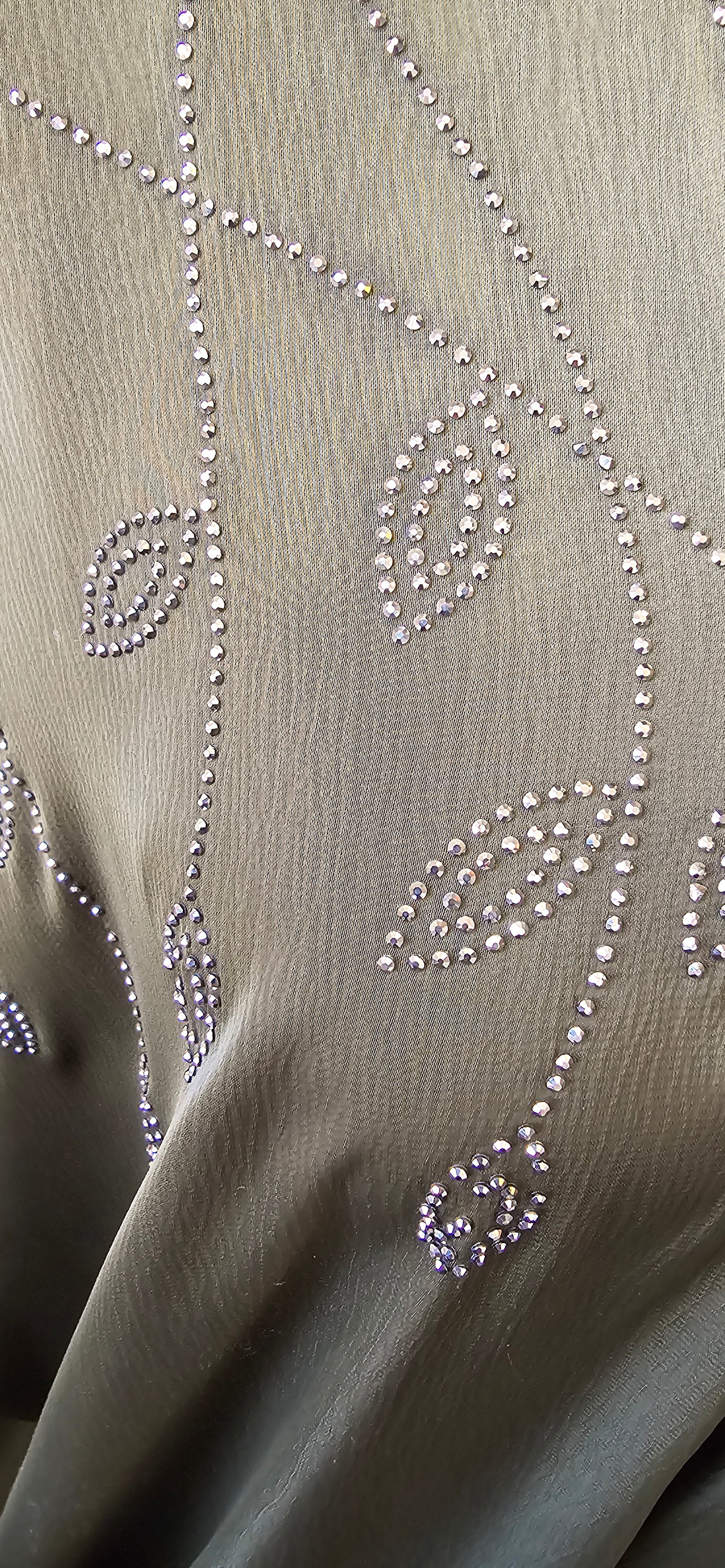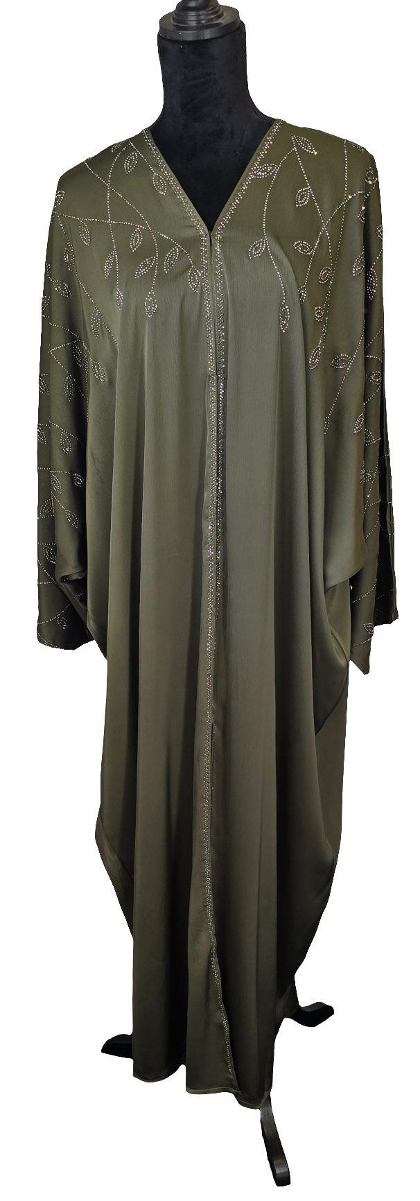 This elegant 2-Piece Abaya Set features a modest and stylish design with small gemstone accents on the sleeves. Made with high-quality material, it's perfect for any special occasion. Includes abaya and scarf. Upgrade your wardrobe with this timeless piece.