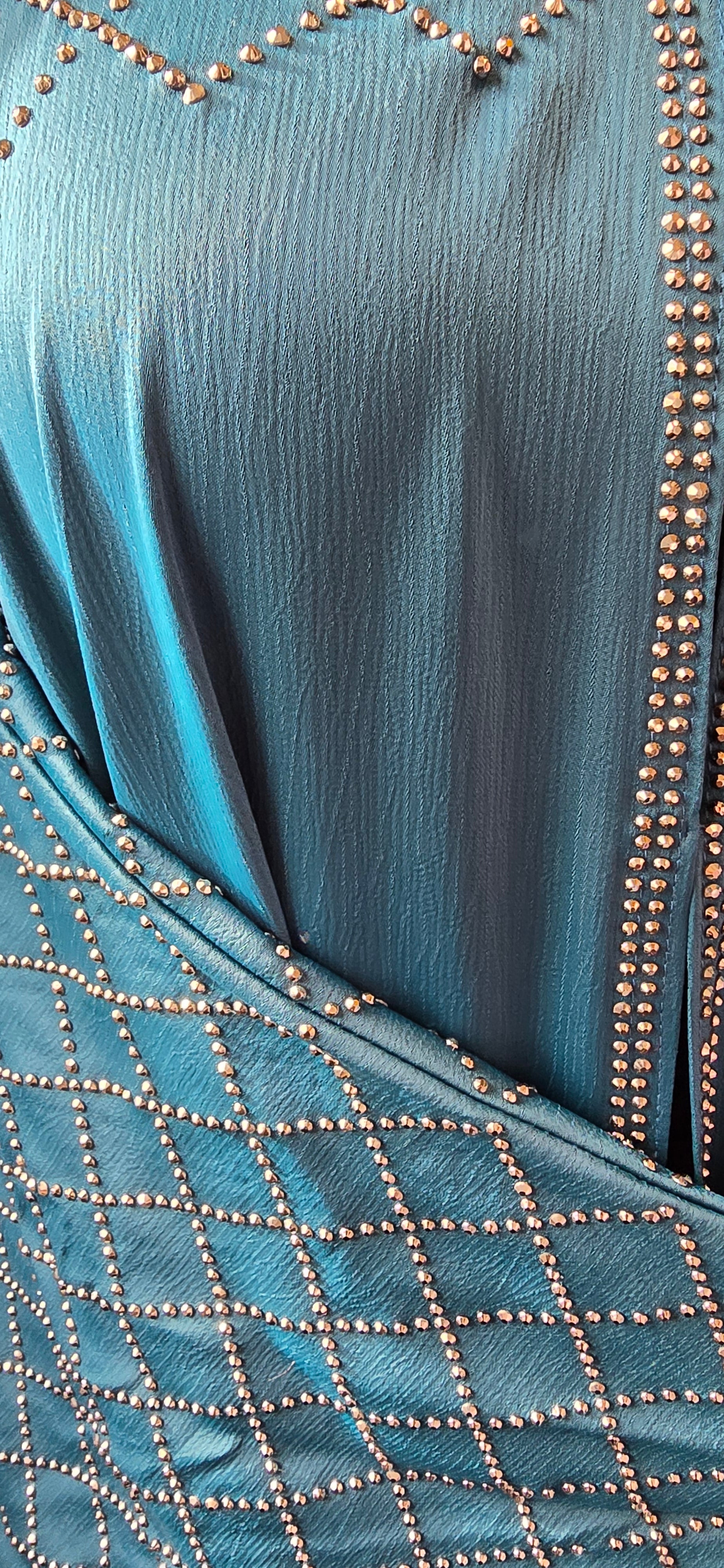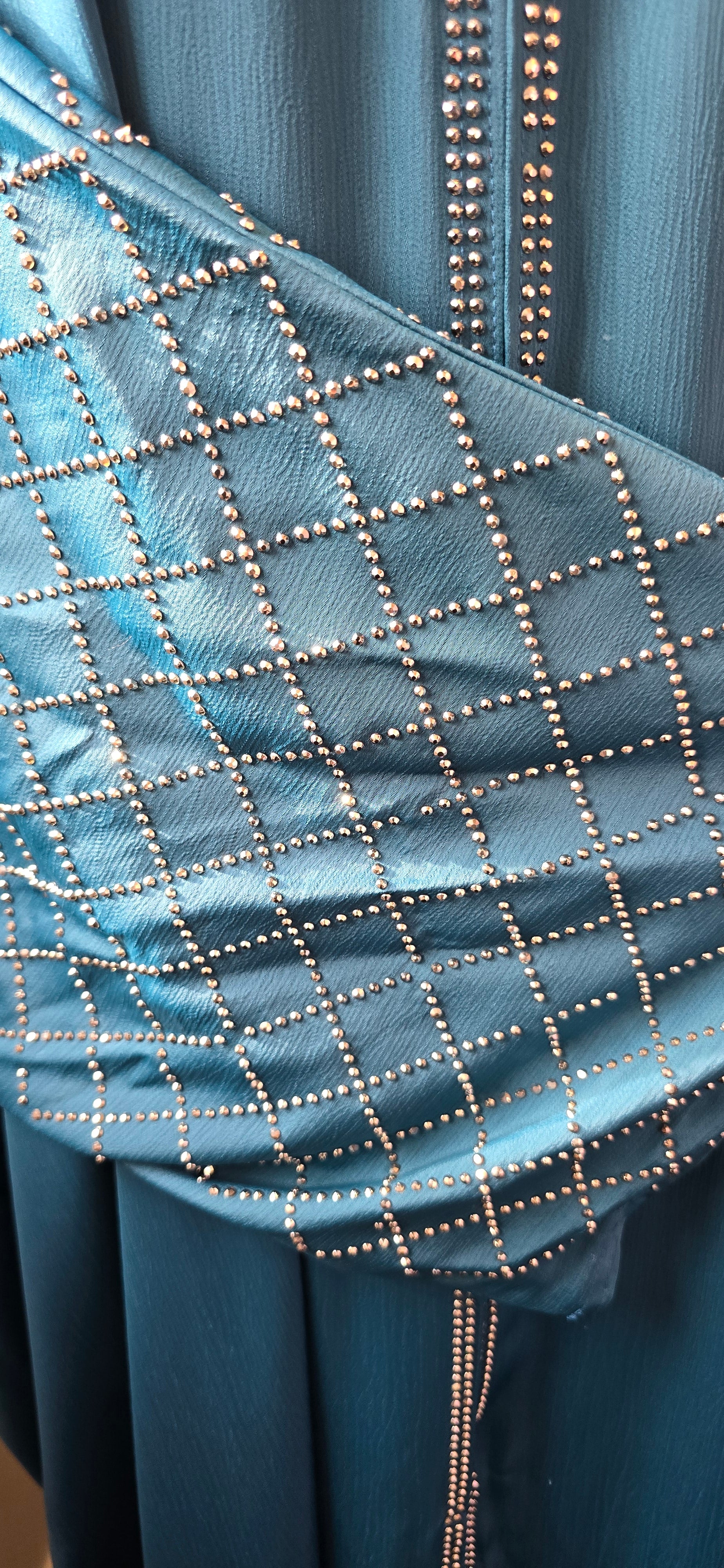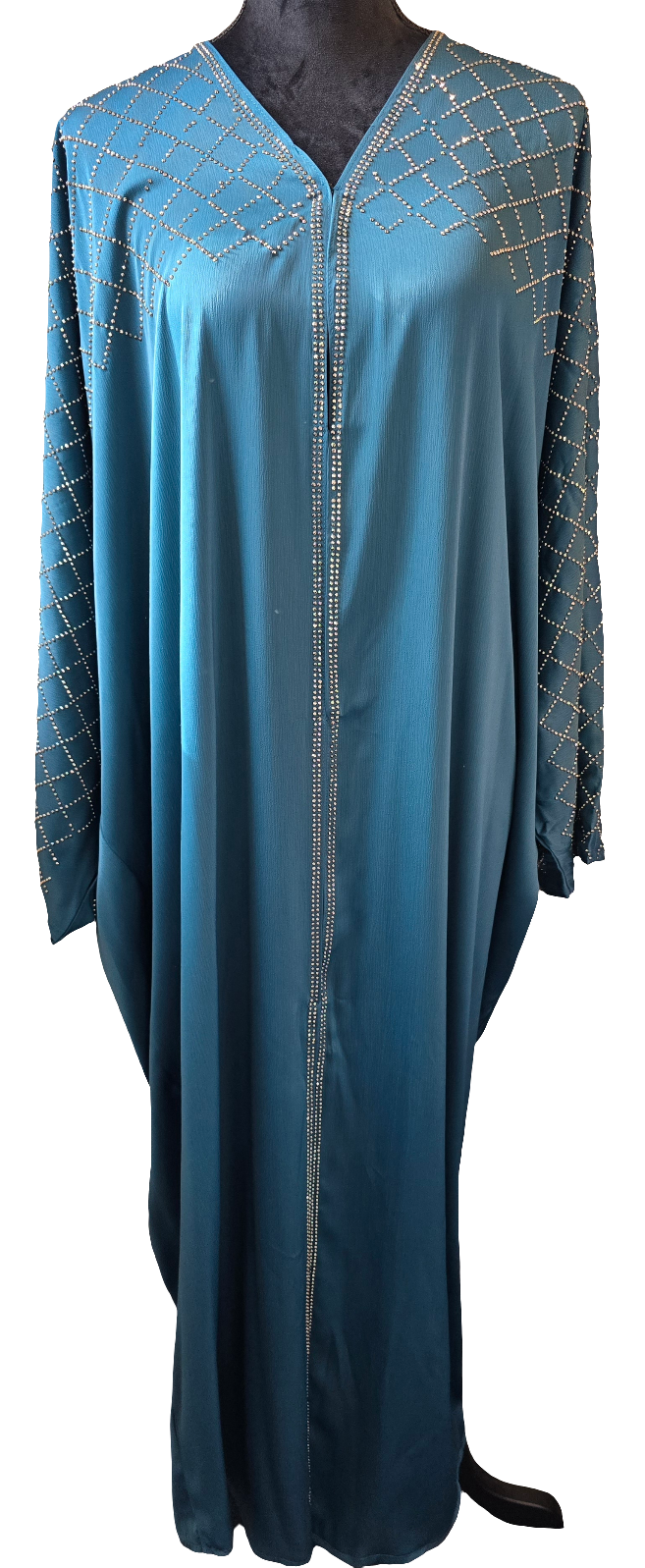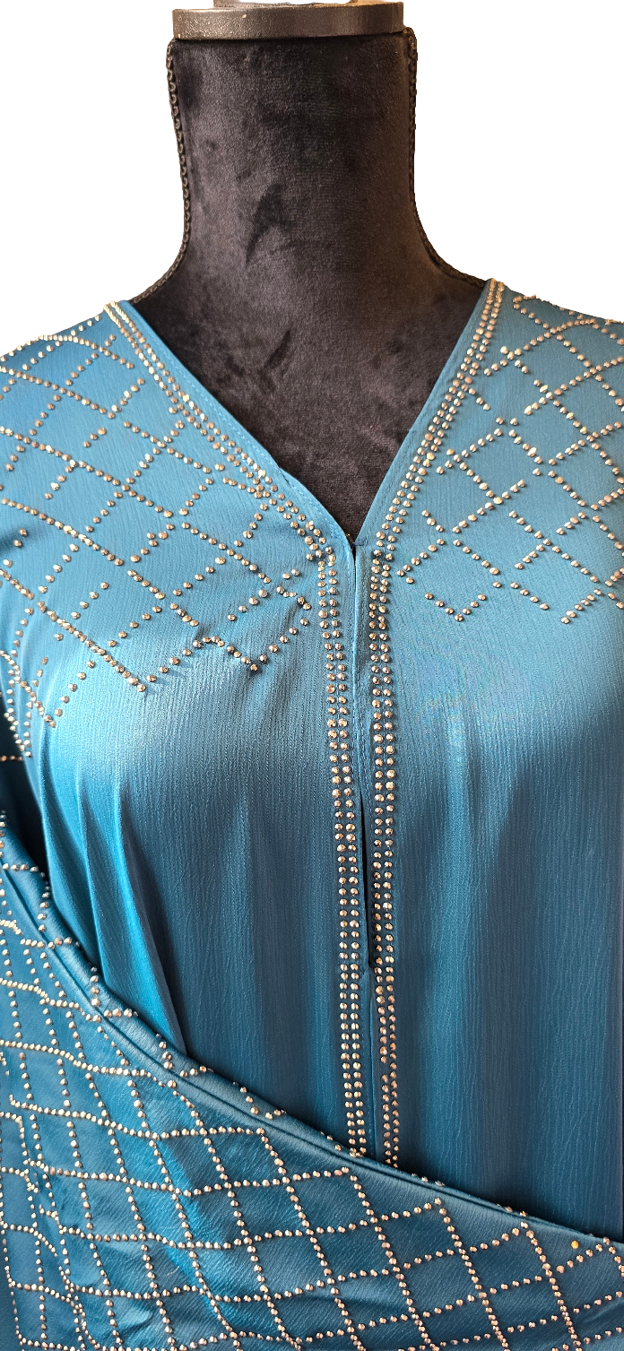 Expertly crafted with gemstone embellishments on the front, back, and sleeves, this 3-piece abaya set exudes elegance and modesty. Perfect for special occasions, the set includes a scarf for added versatility and a belt for adjustment. Stand out in style with this uniquely designed abaya set.