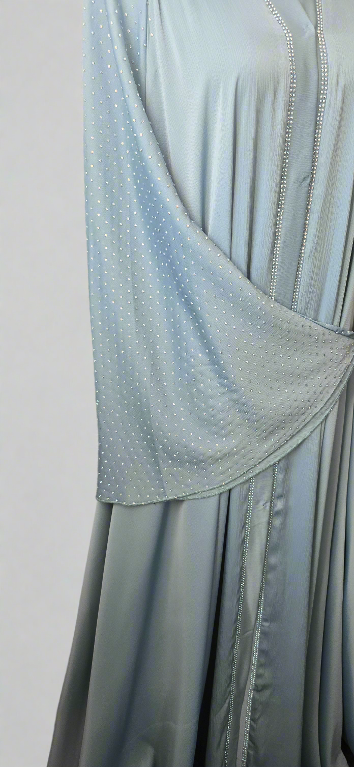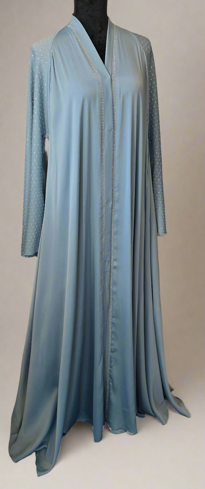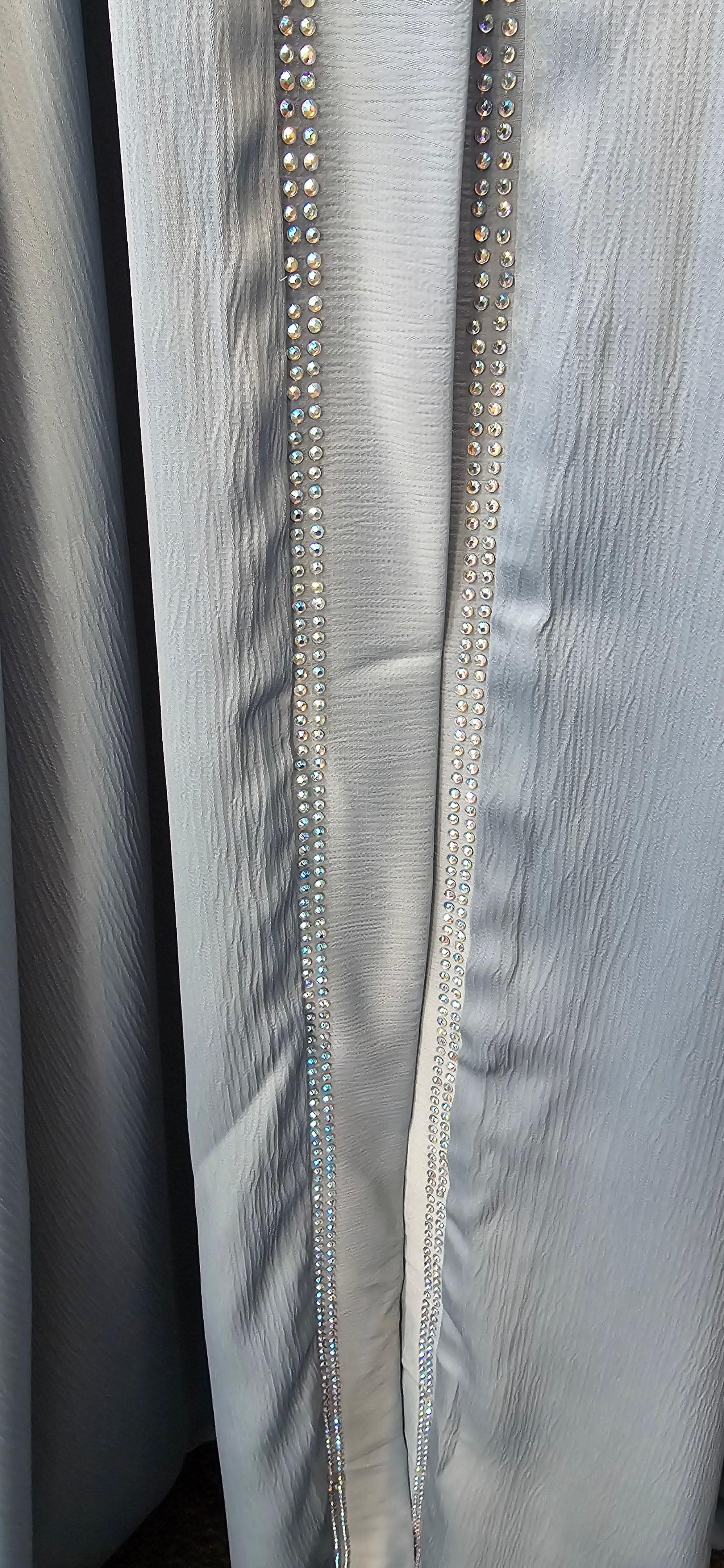 Upgrade your party attire with our Abaya 3-Piece Set. The light blue color adds elegance and the gemstones on the sleeves and border elevate the modest design. Made with comfort in mind, this set comes with an abaya belt and scarf. Perfect for any special occasion.