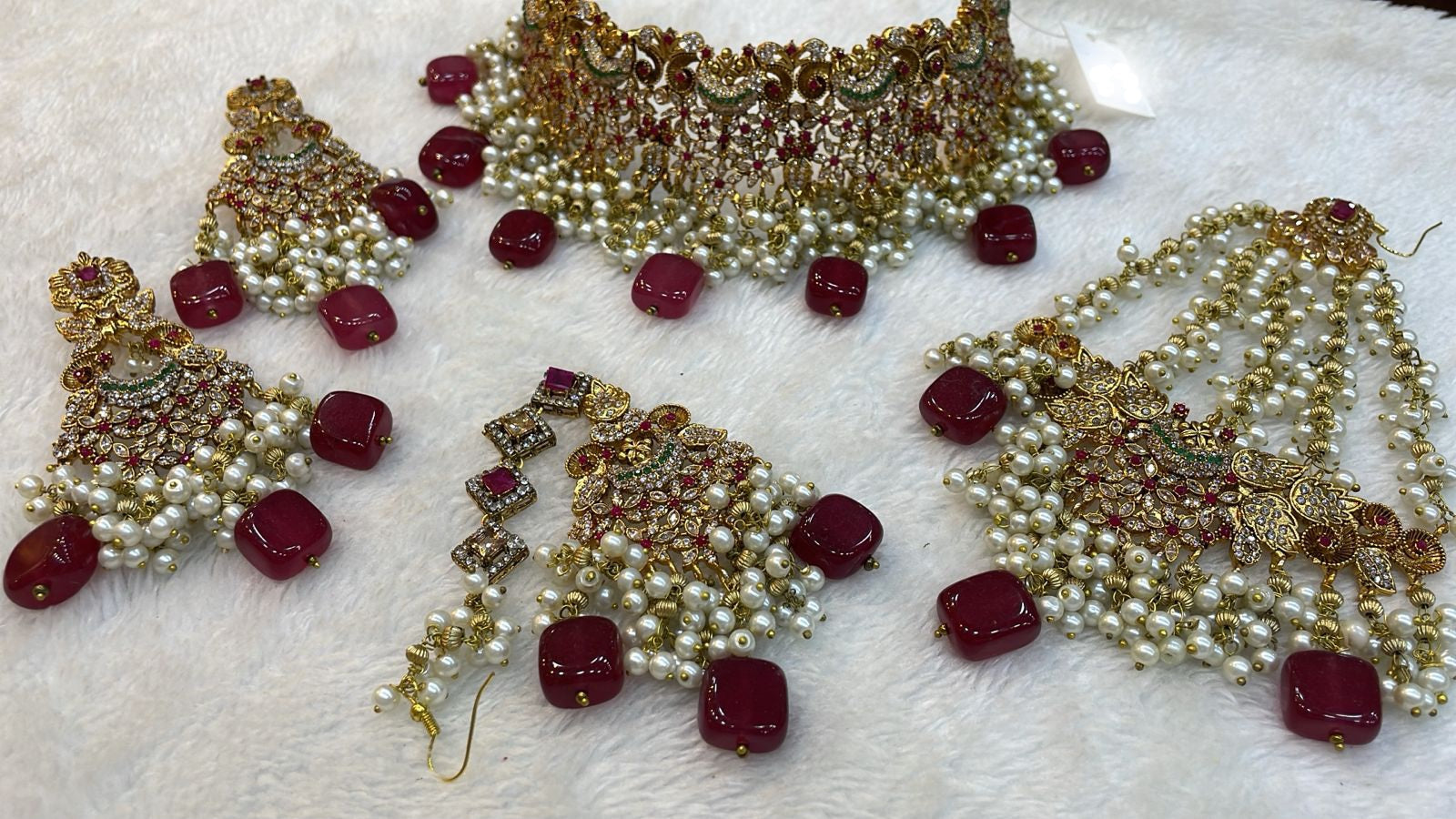Introducing the Bridal Navratan 5 piece Set, a perfect combination of elegance and beauty. This set features five stunning pieces that will elevate your bridal look, including necklace, earrings, maang tikka and Jhumar. Each piece is intricately designed to add a touch of glamour to your special day.