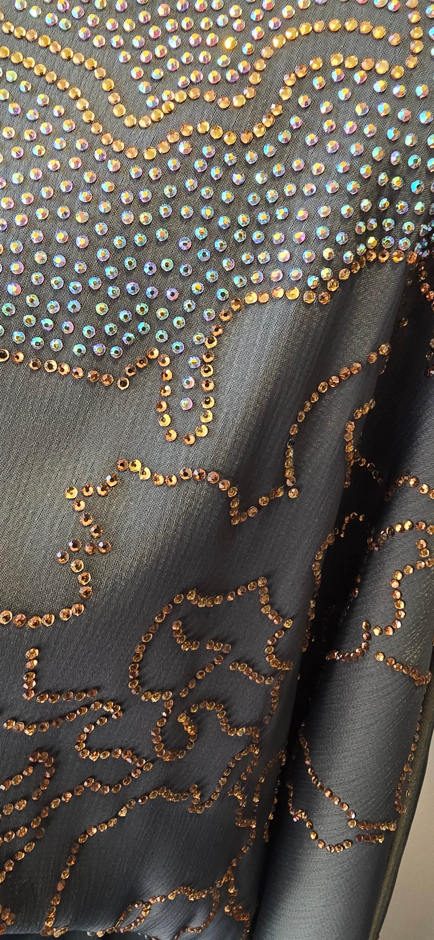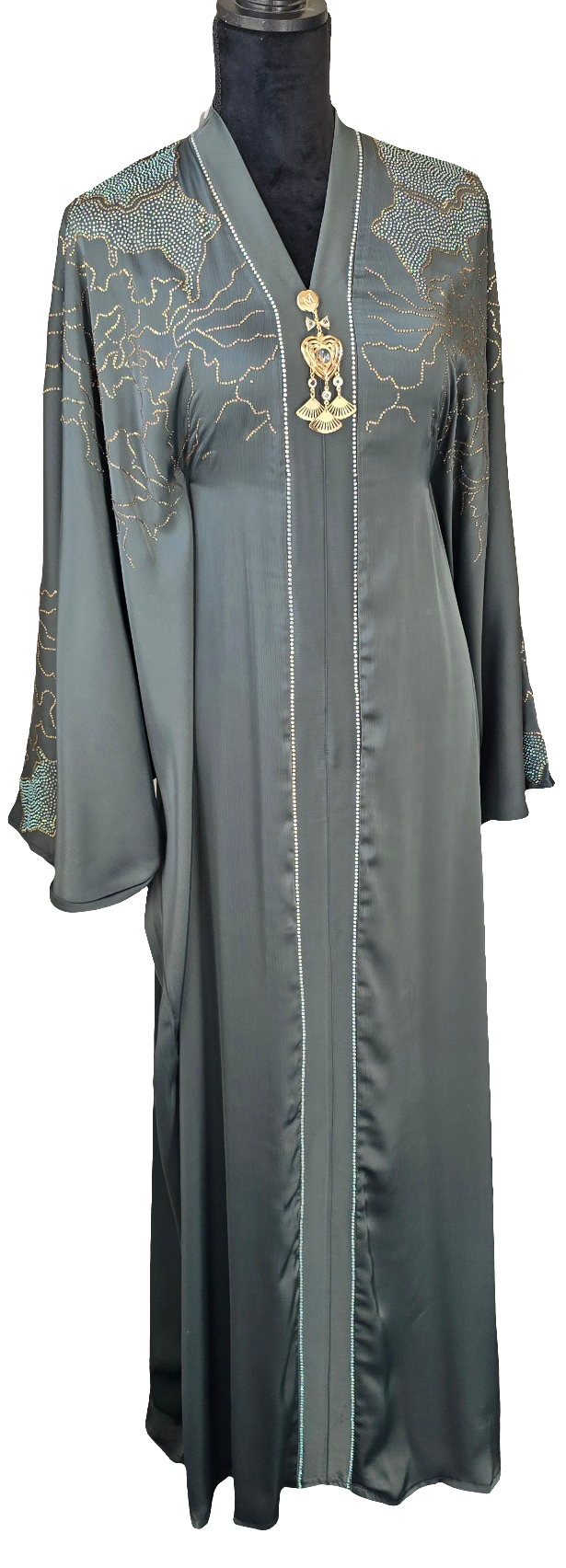 Introducing the Butterfly Abaya 2-Piece Set, a stunning and versatile addition to your wardrobe. This set includes an abaya and scarf, with a belt attached for a beautiful butterfly shape. The gemstone design on the sleeves and charming details make it perfect for parties and special occasions. Elevate your modest and elegant style with this expertly crafted abaya.