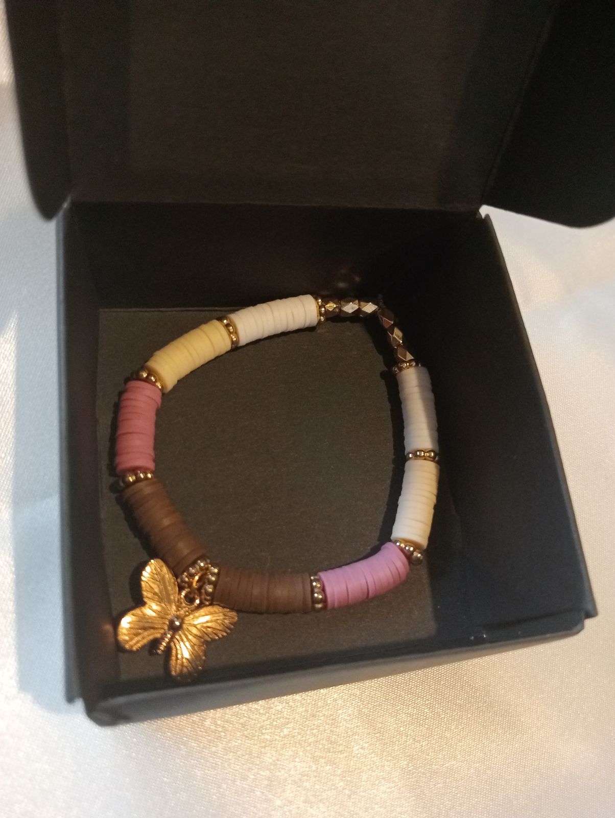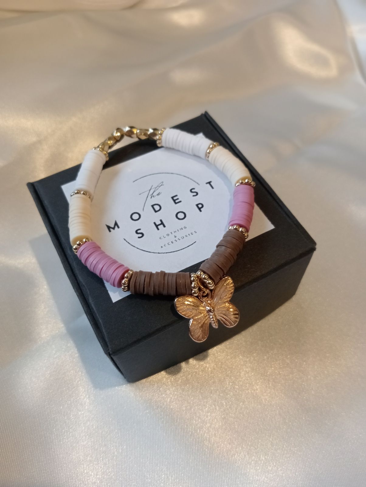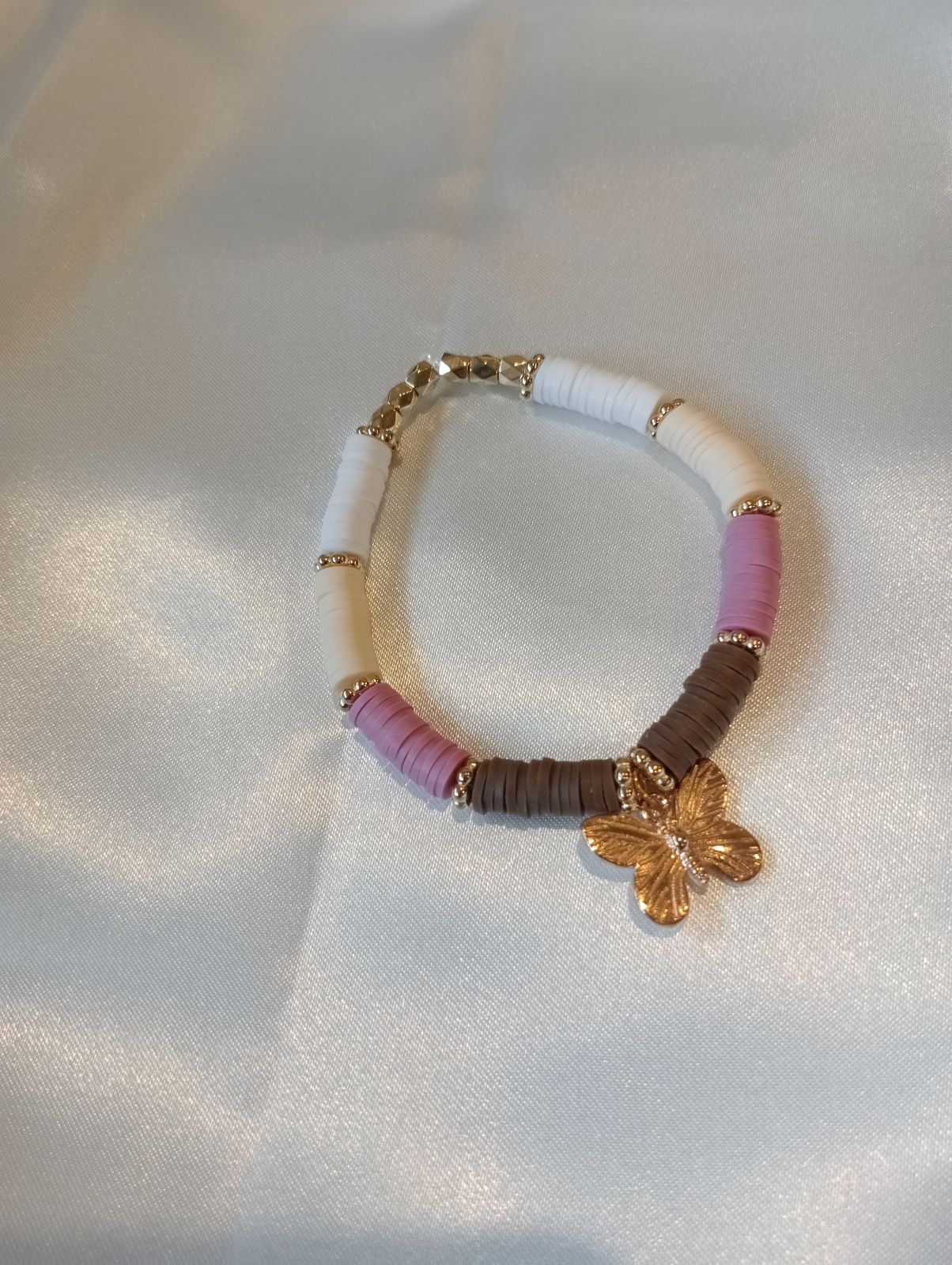 This is a handmade bracelet made of brown, dark pink, beige and white beads separated by gold ring beads with a butterfly charm in the middle.