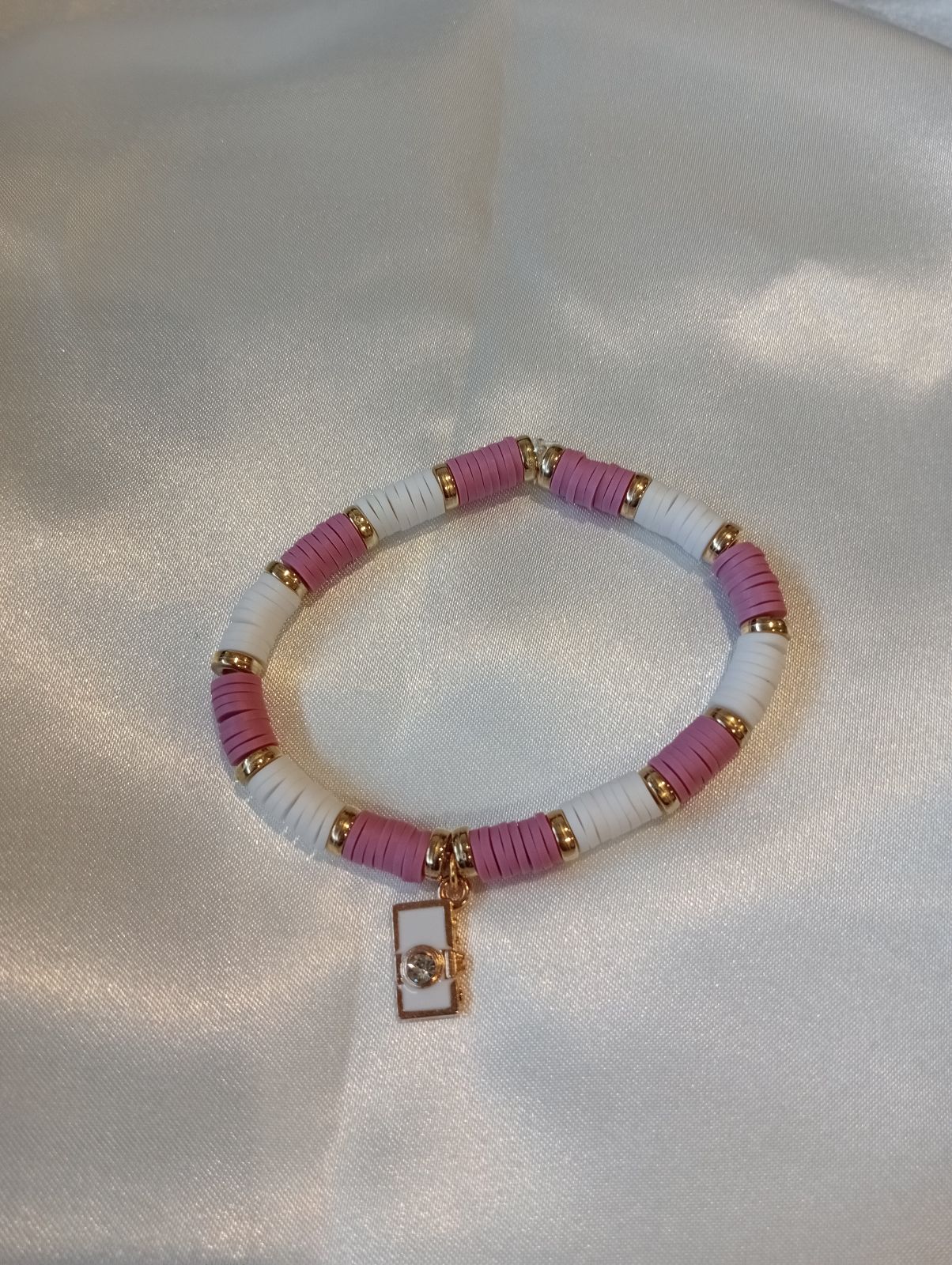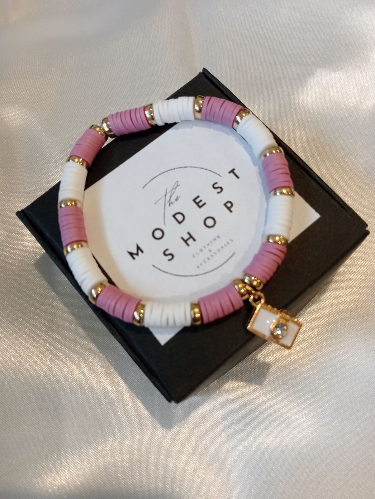 This is a handmade bracelet made of white and dark pink separated by gold bead rings with a camera charm in the middle.