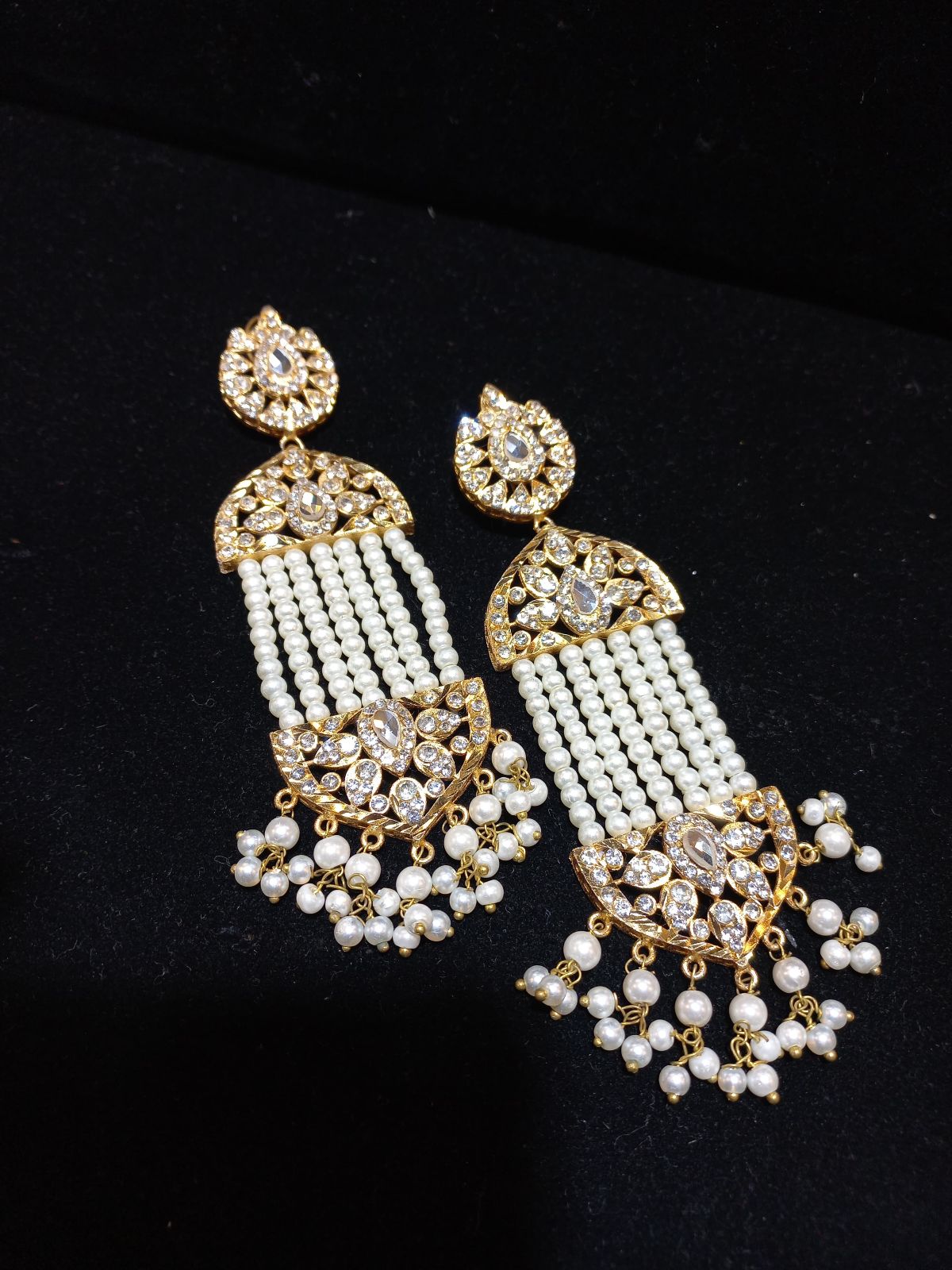 Upgrade your bridal or party look with these elegant earrings featuring luminous white pearls and intricately designed stones. Perfect for adding a touch of sophistication and traditional charm to any outfit.