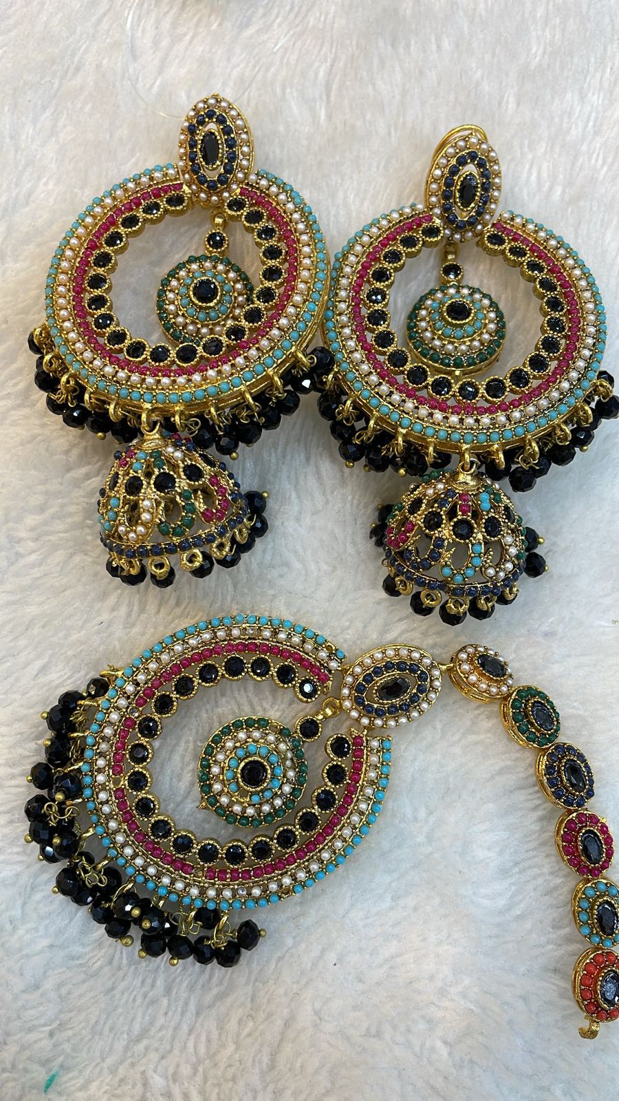 Enhance your style with our Earrings and Bindiya Set! This set includes stunning earrings adorned with a variety of colorful stones and pearls. Elevate any look with our eye-catching design and add a touch of elegance to your outfit.