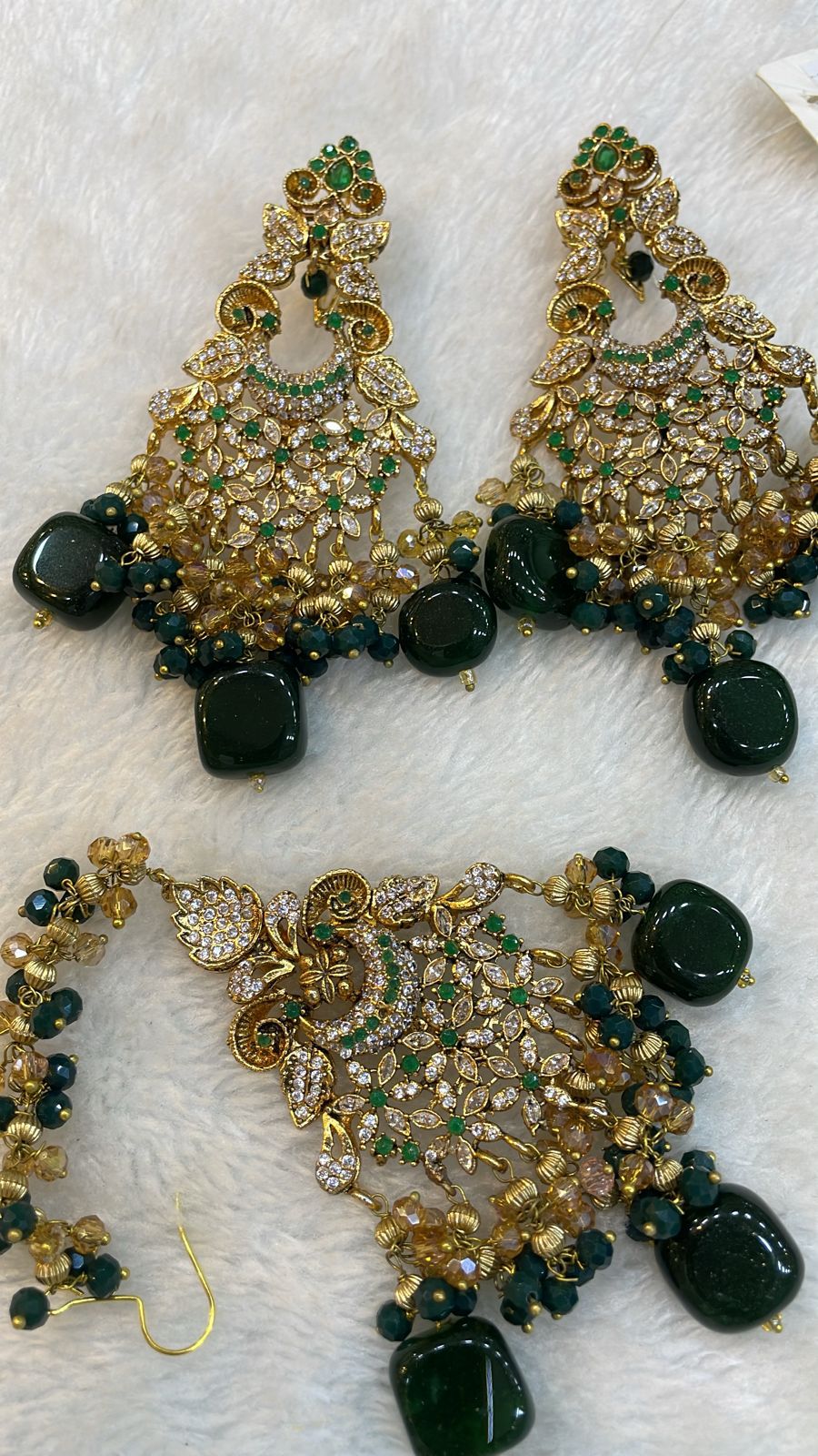Enhance your look with our stunning green earrings and bindiya set adorned with real stones. The intricate design and high-quality materials exude sophistication and elegance, making it the perfect accessory for any occasion. Elevate your style with this versatile and timeless set.