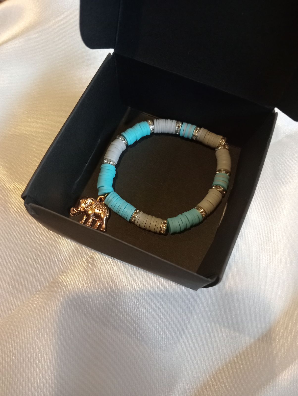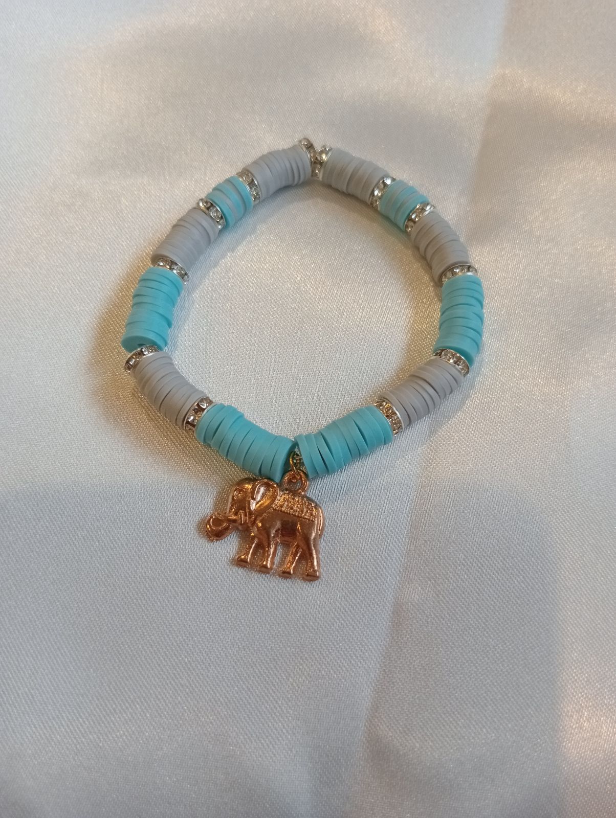 This is a handmade bracelet made of light blue, light grey beads separated by silver bead rings with an elephant charm in the middle.