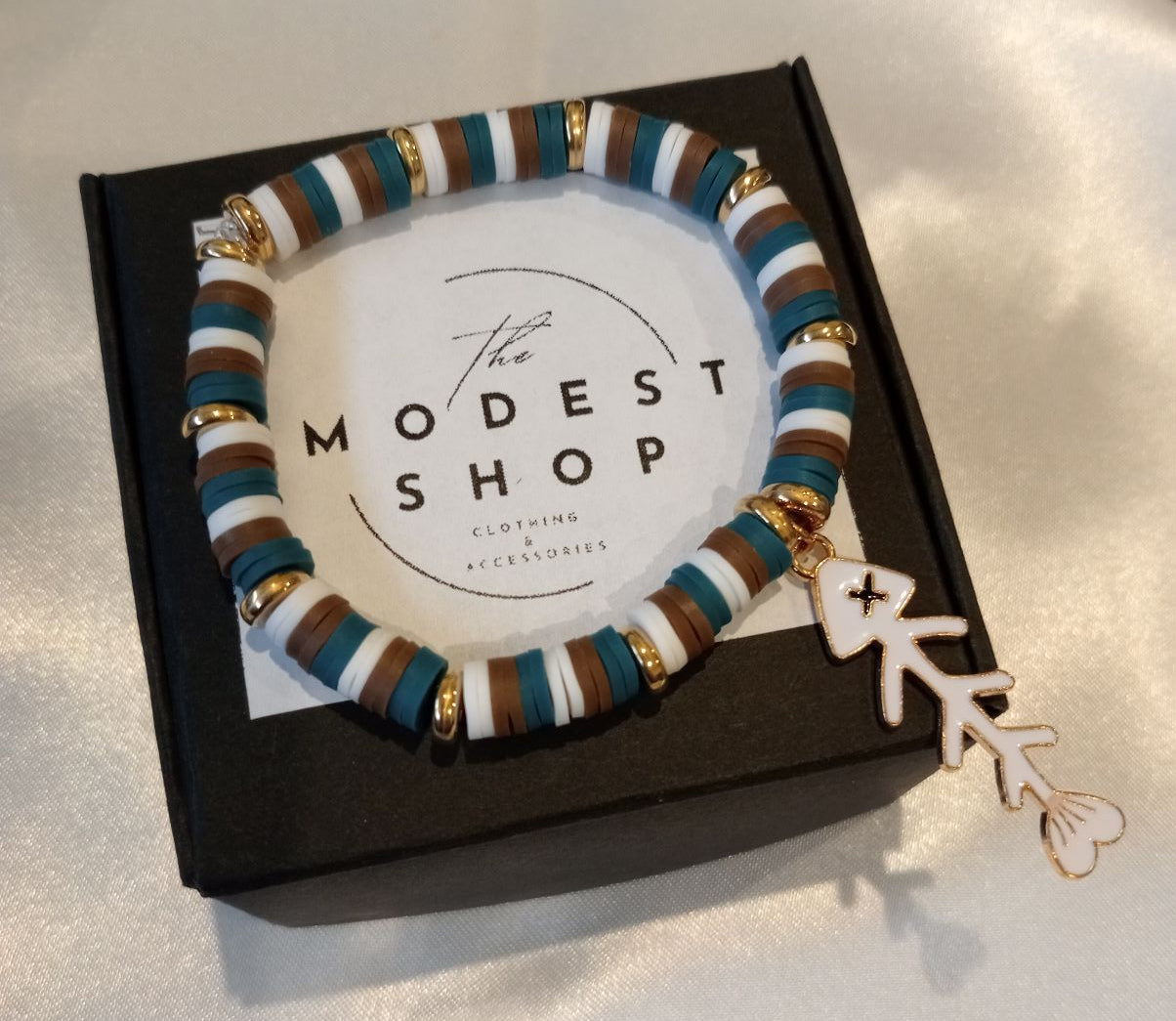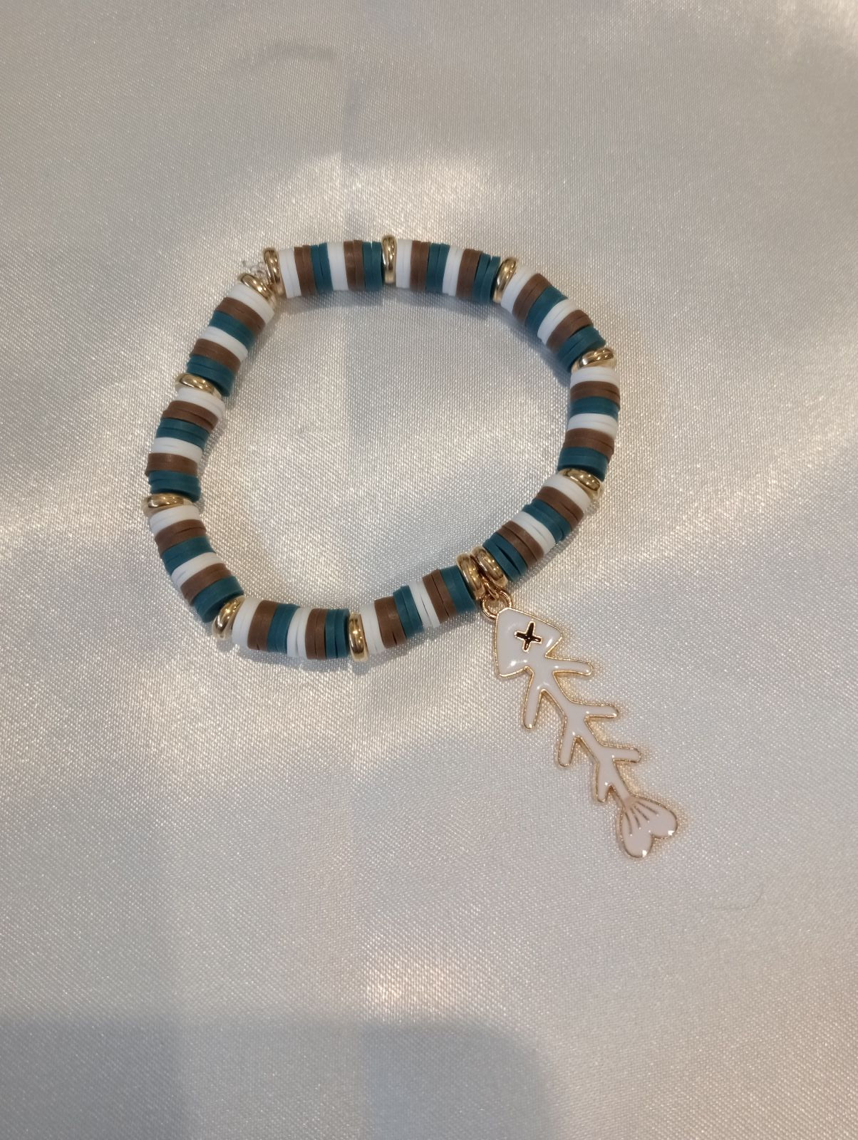 This is a handmade bracelet made of brown, dark green teal and white beads separated by gold bead rings with a fish charm in the middle.
