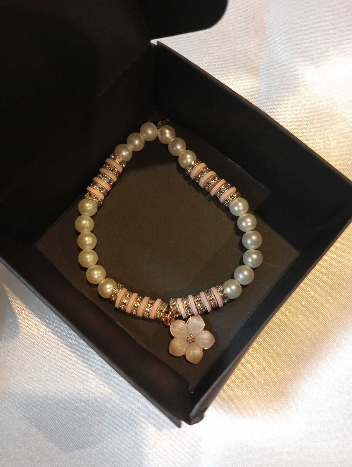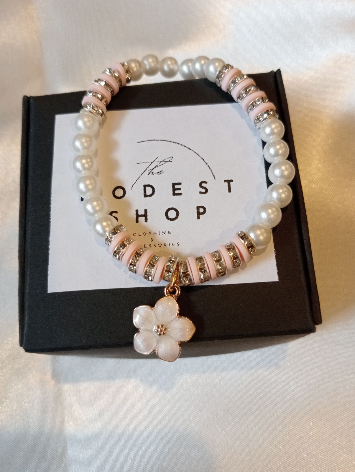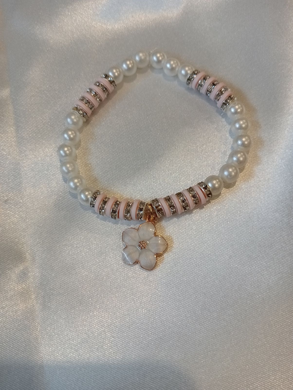 This is a handmade bracelet made of light pink beads separated by silver bead rings it is also made of white pearls with a white flower charm in the middle.