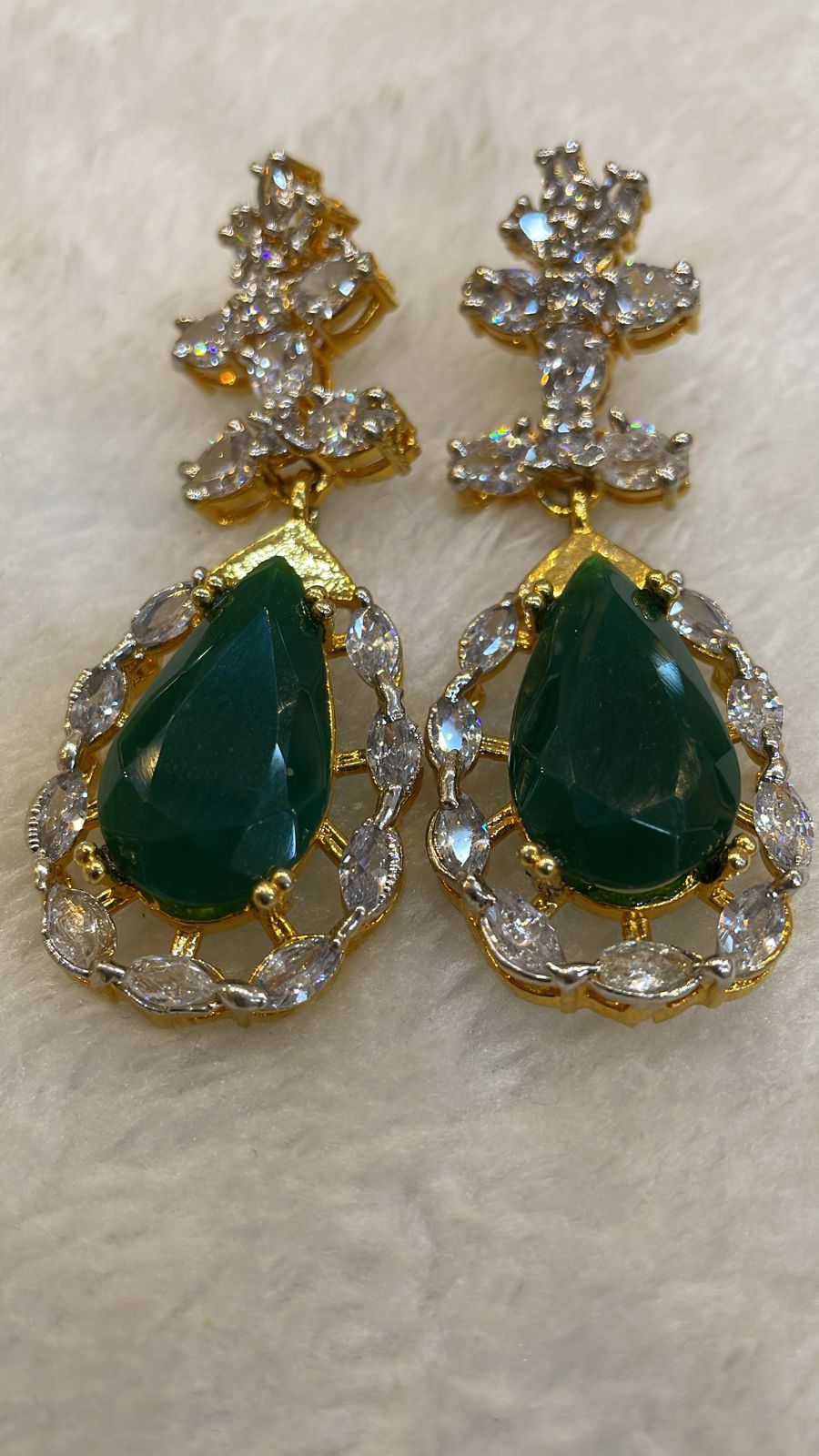 These elegant gold-plated earrings feature a stunning green stone that adds a touch of sophistication to any outfit. The high-quality materials and exquisite design make them a timeless addition to your jewelry collection. Elevate your style with these beautiful and versatile earrings.