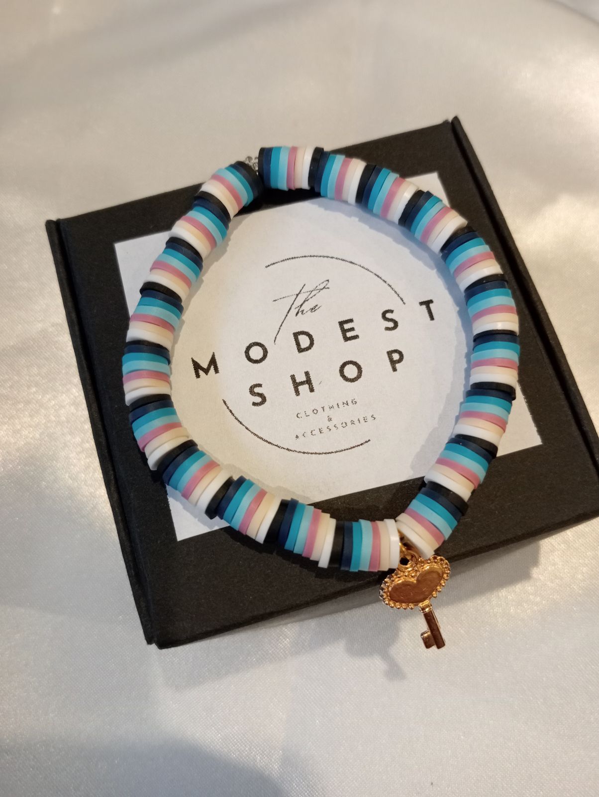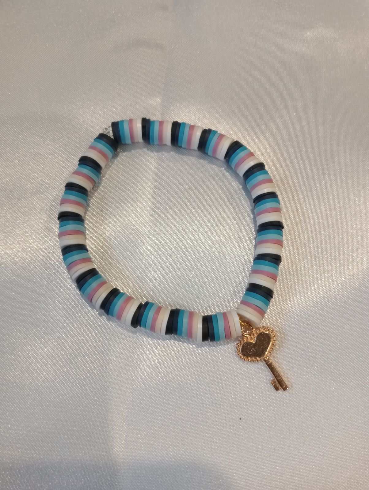 This is a handmade bracelet made of black, navy blue, blue, light blue, pink, beige and white beads with a heart key charm in the middle.