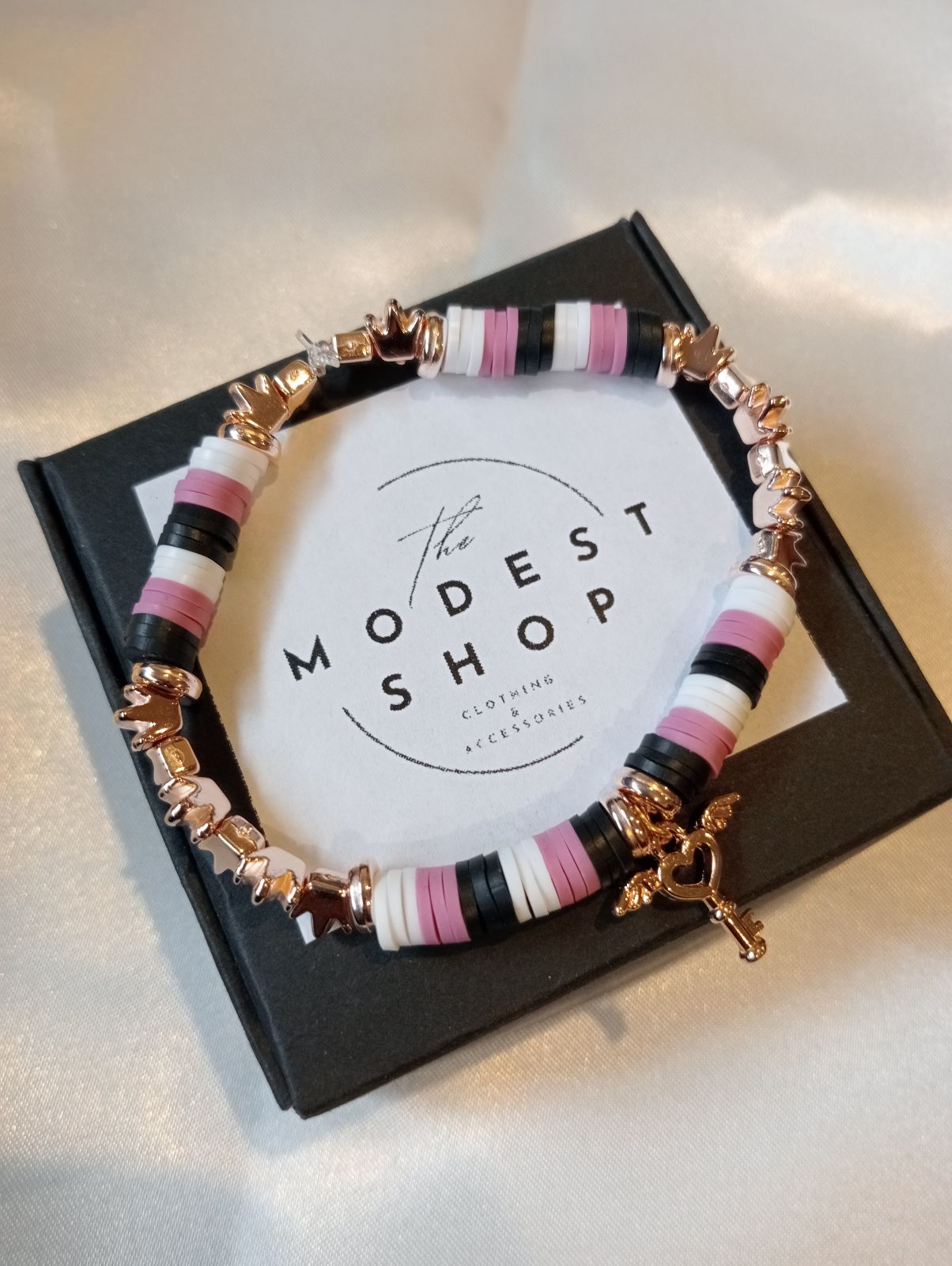 This is a handmade bracelet made of black, dark pink, and white beads separated by rose gold bead rings and rose gold crown beads with a heart key in the middle.