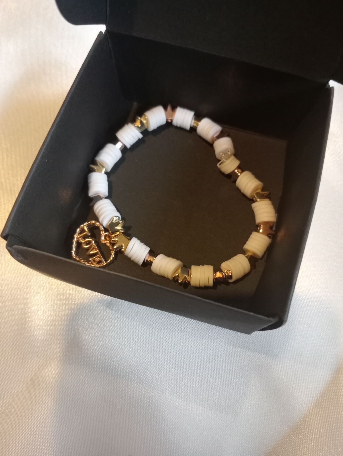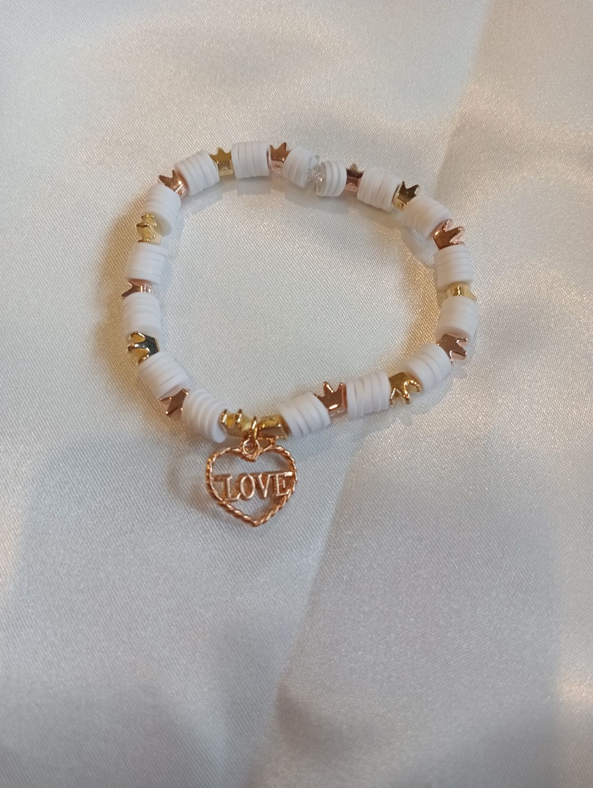 This is a handmade bracelet made of white beads separated by small gold crown beads with a heart shaped "love" charm in the middle.