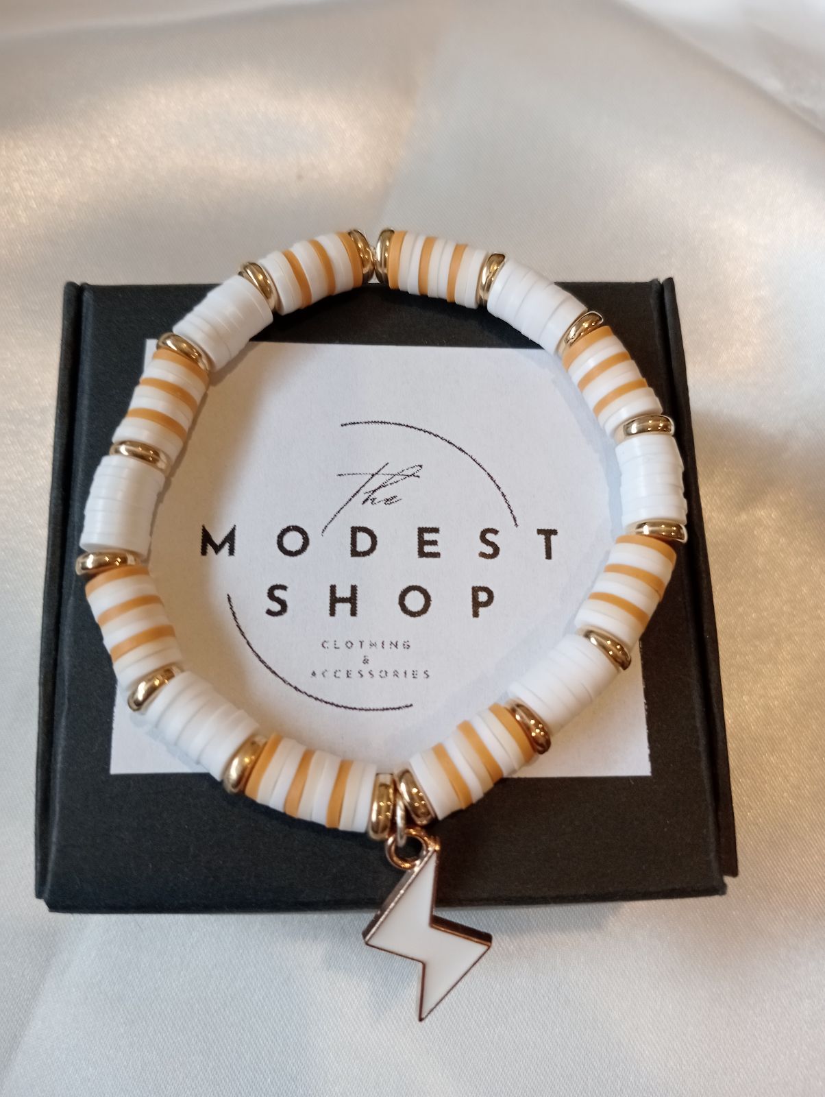 This is a handmade bracelet made of dark yellow, beige and white beads separated by gold bead rings with a lightning charm in the middle.