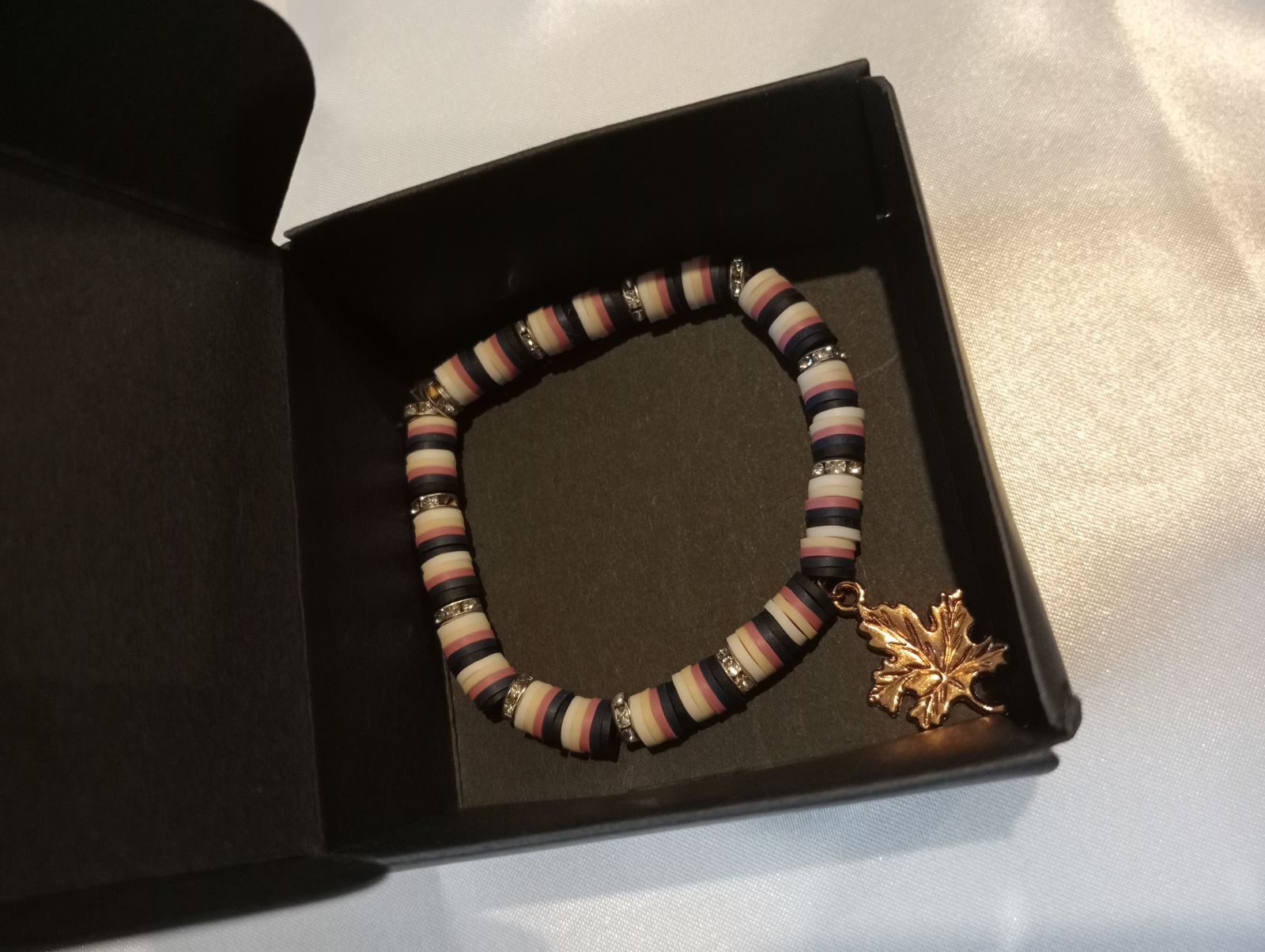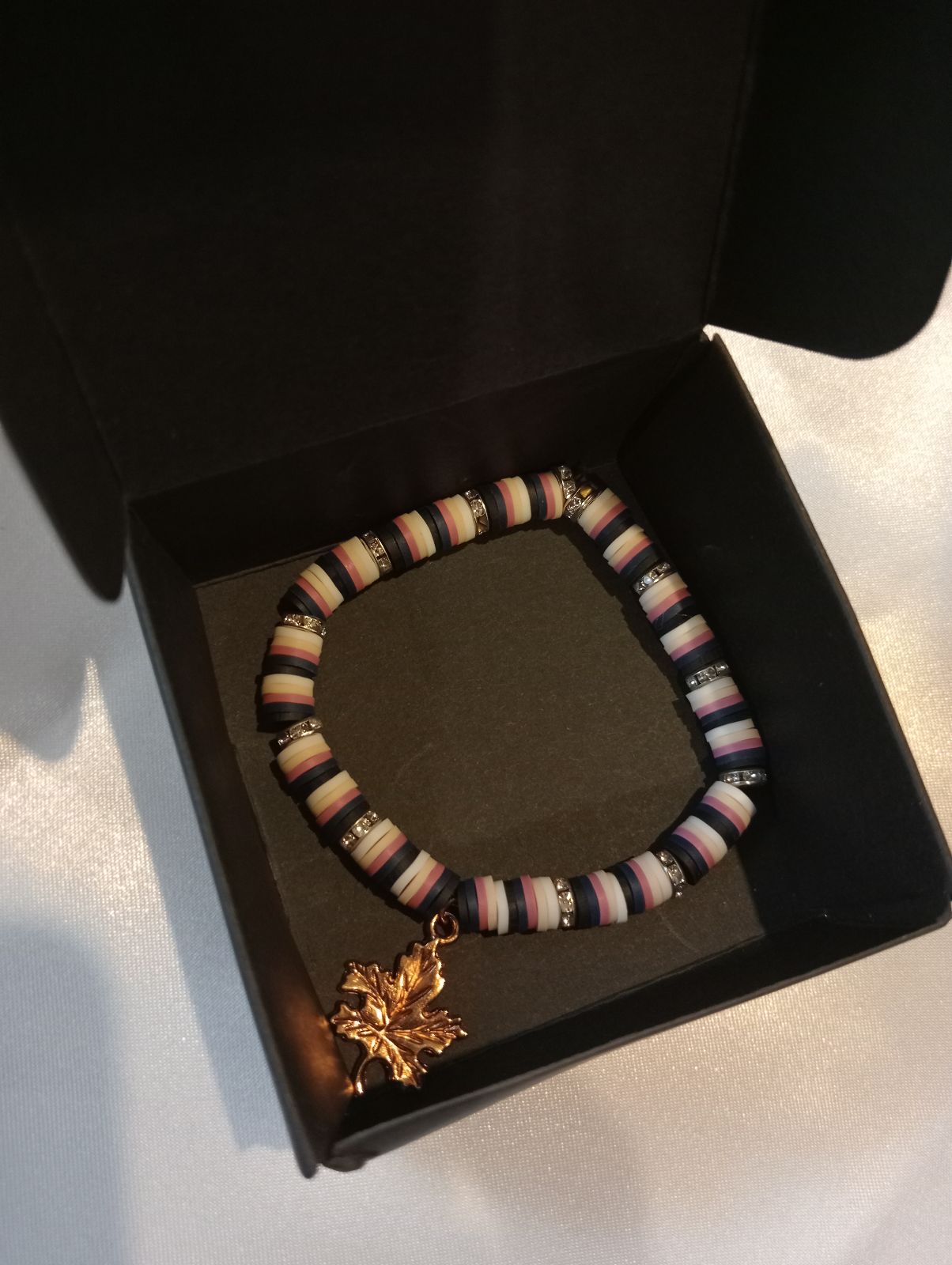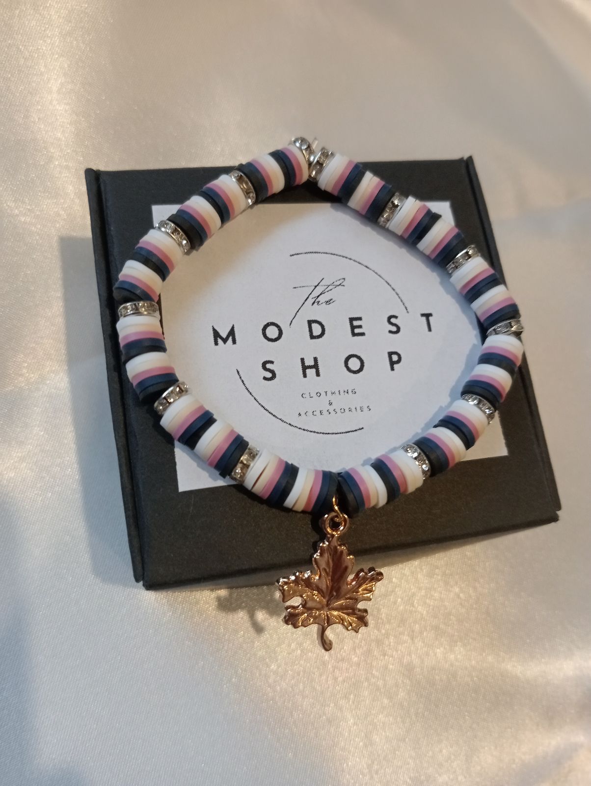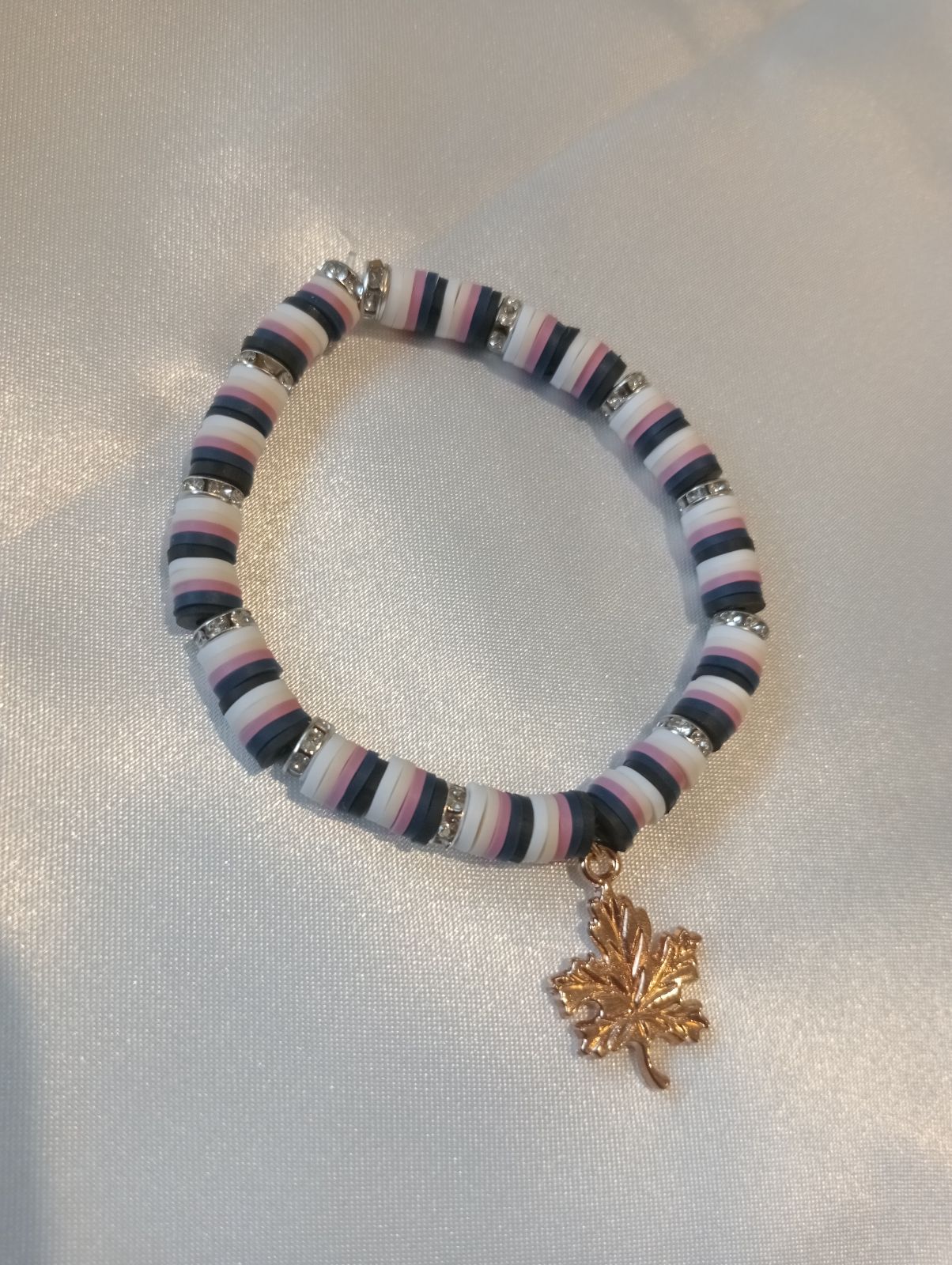 This is a handmade bracelet made of navy blue, pink, beige and white beads separated by silver bead rings with a maple leaf charm in the middle.