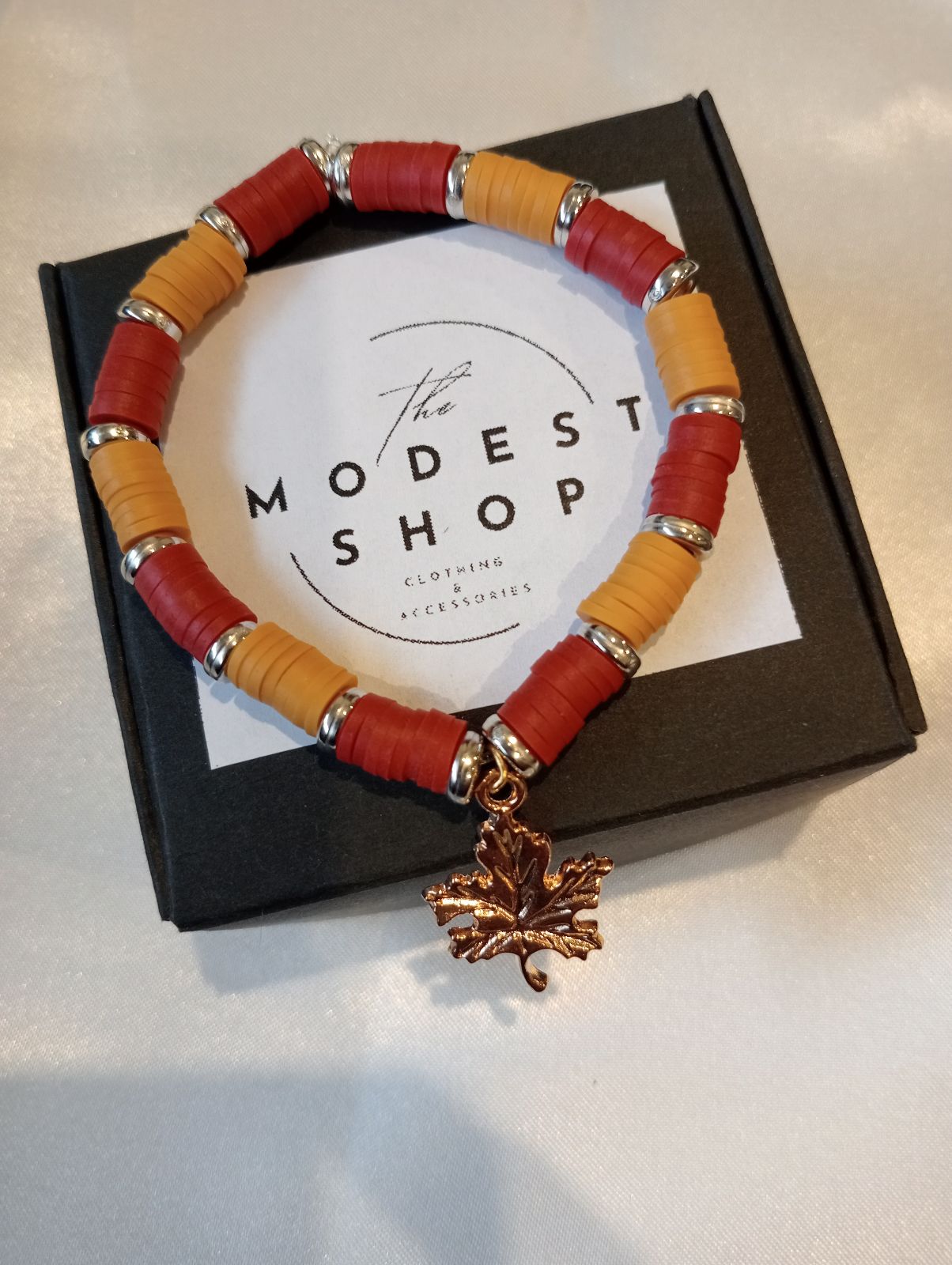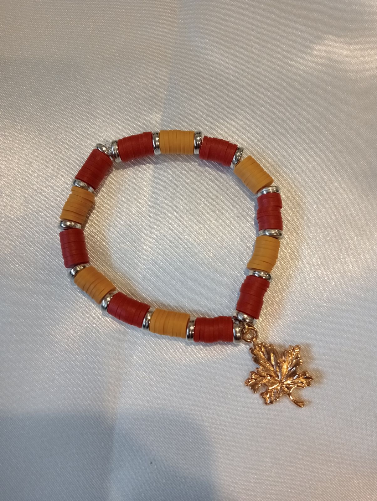 This is a handmade bracelet made of red and dark orange beads separated by gold bead rings with a maple leaf charm in the middle.
