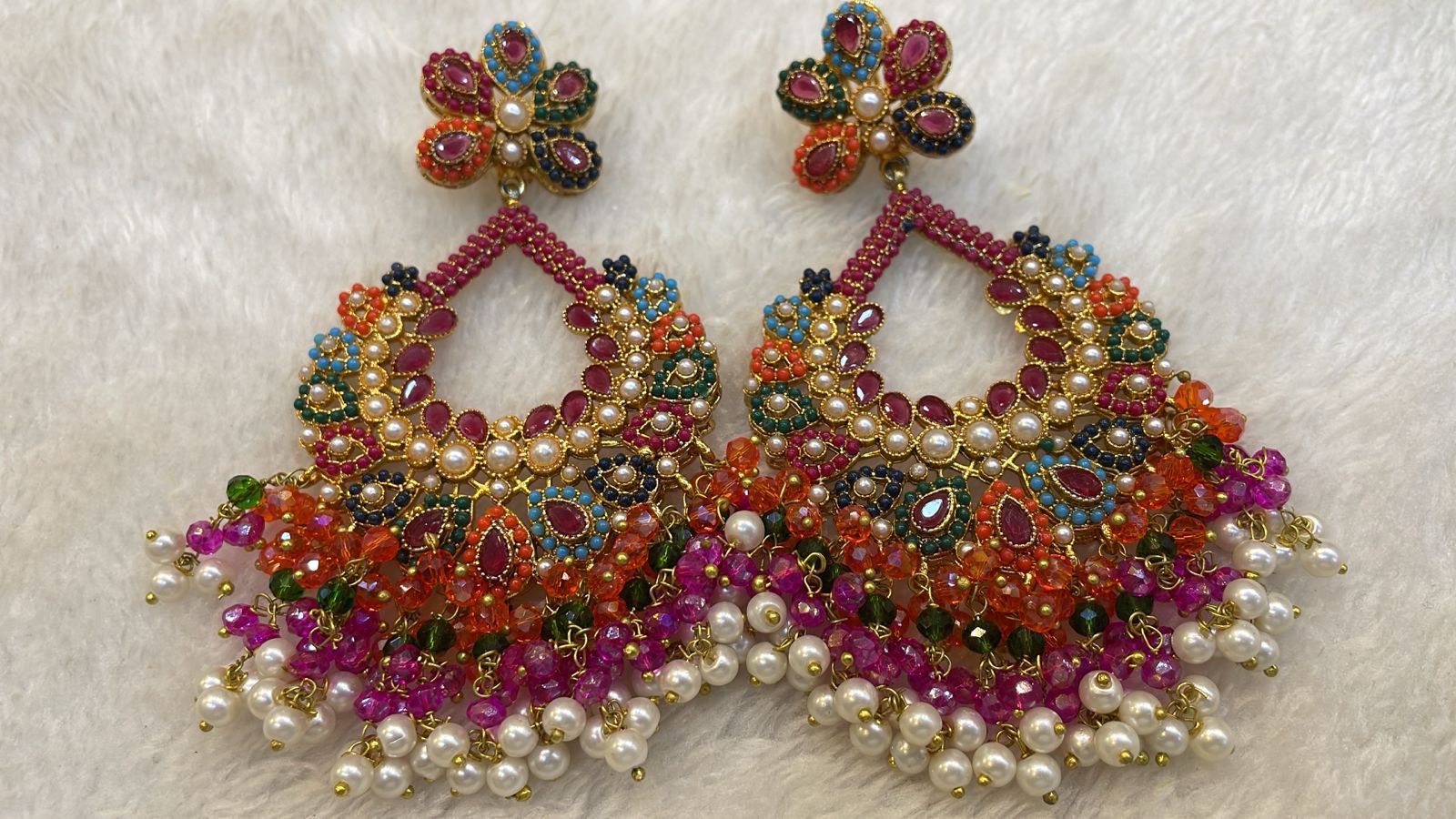 Add a touch of elegance to your outfit with our Multicolour Earrings. These partywear earrings feature stunning stones and pearls, expertly crafted for a sophisticated look. Perfect for any occasion, you'll love the beautiful multi-colour design.