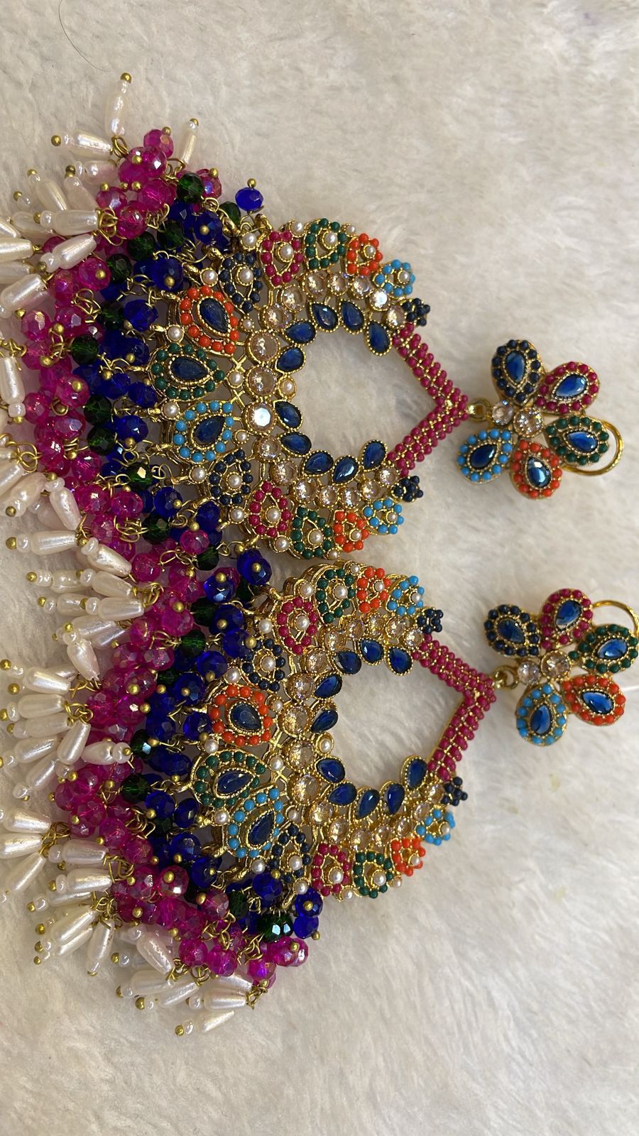 Enhance your party look with our beautifully crafted multi-coloured earrings adorned with stones and pearls. Stand out in style and effortlessly add sophistication to your outfit. These statement earrings are the perfect addition to any formal or special occasion.