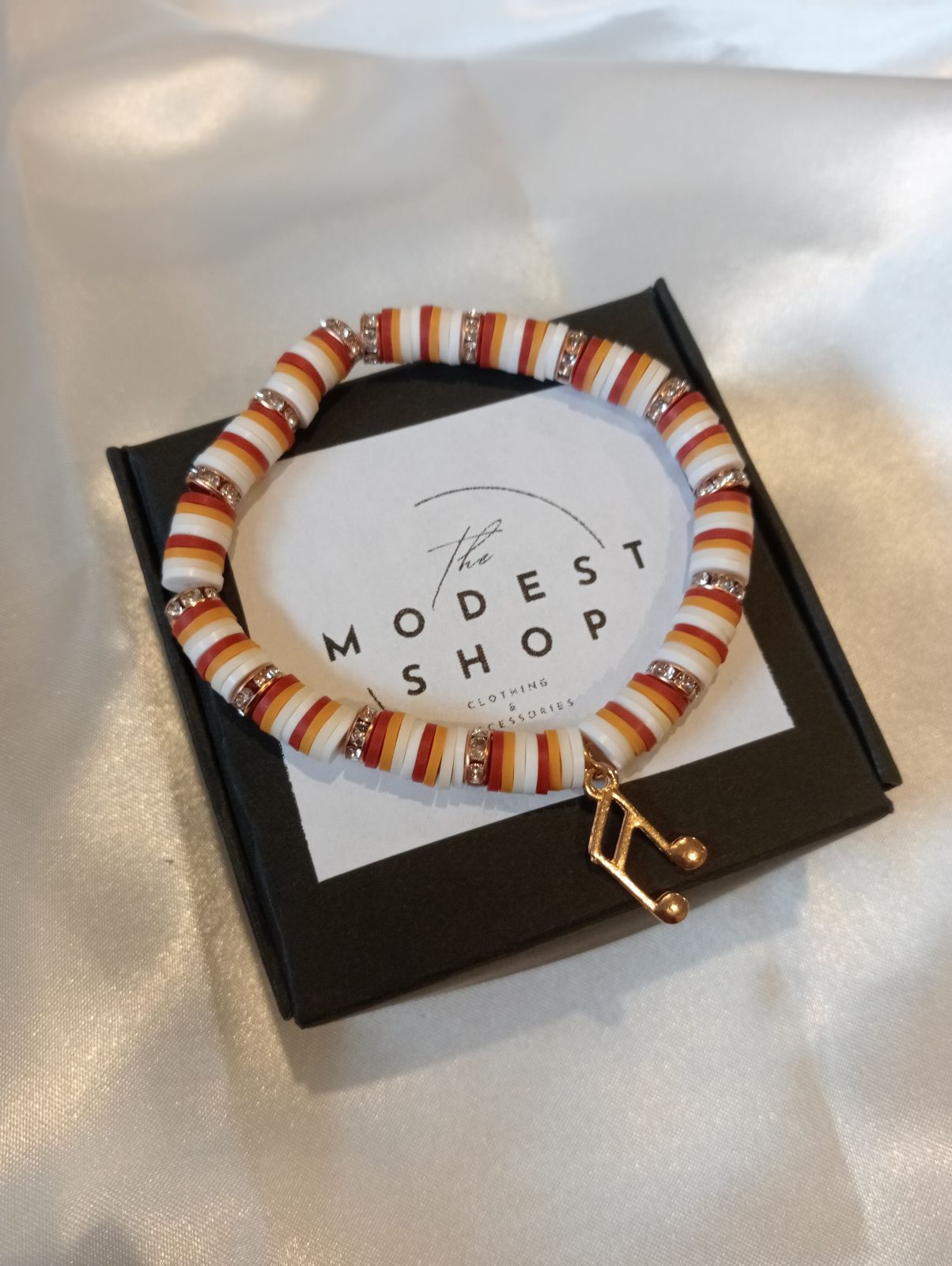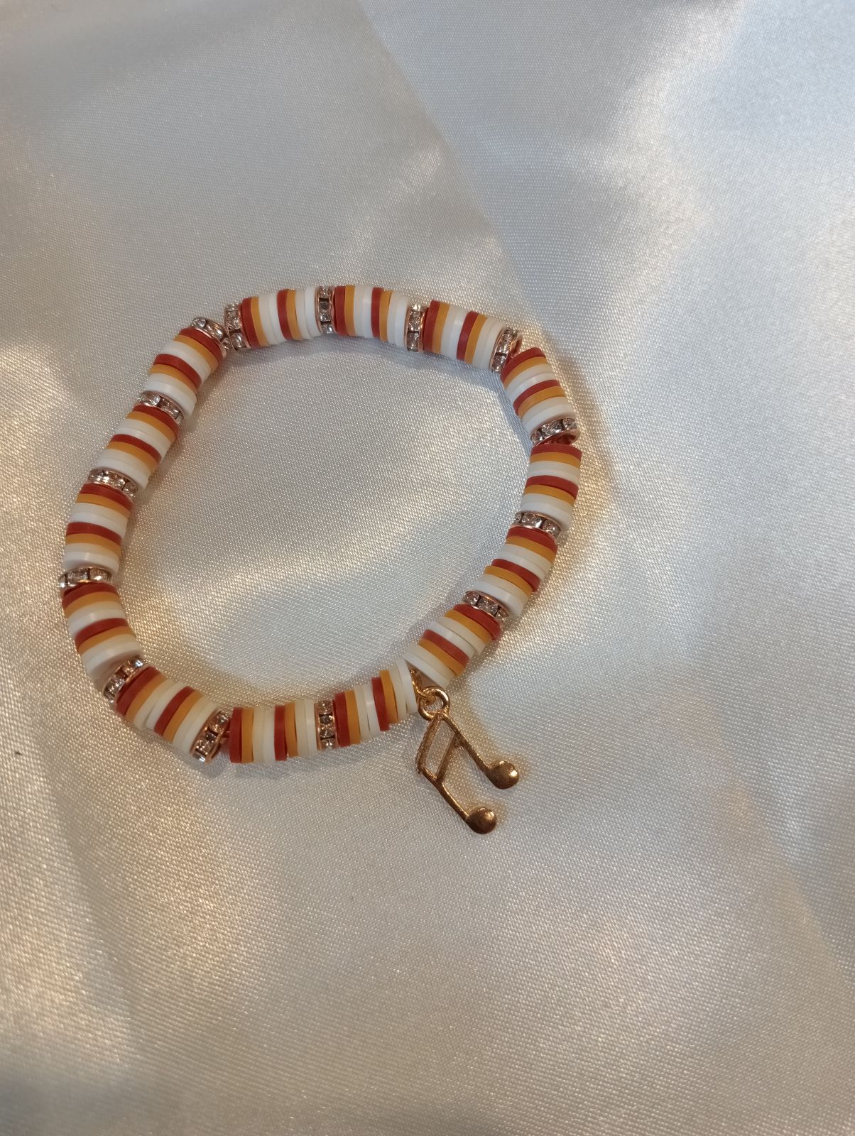 This is a handmade bracelet made of orange, red, beige, and white beads with a music note charm in the middle and each set of beads is separated with a rose gold bead ring.