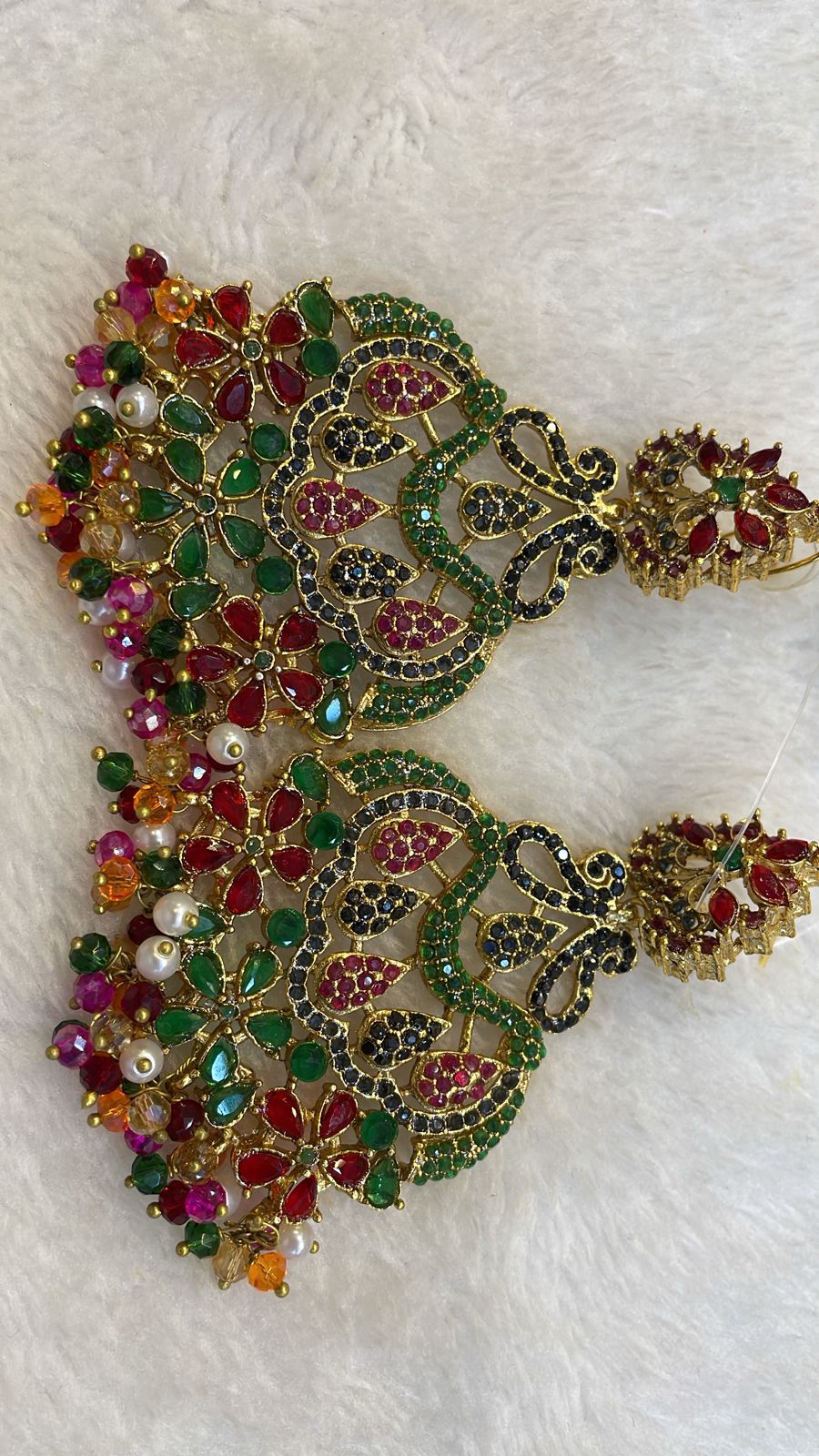 These Partywear Earrings are expertly crafted with stones and pearls, adding a touch of elegance and glamour to any outfit. Their multi-color design makes them versatile for any occasion, while the superior craftsmanship ensures long-lasting wear. Elevate your style with these stunning statement earrings.