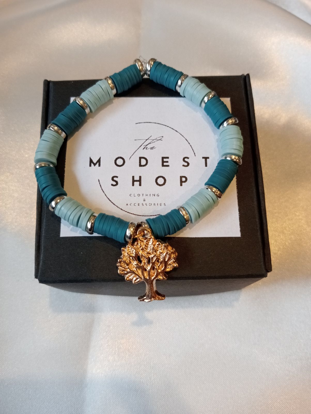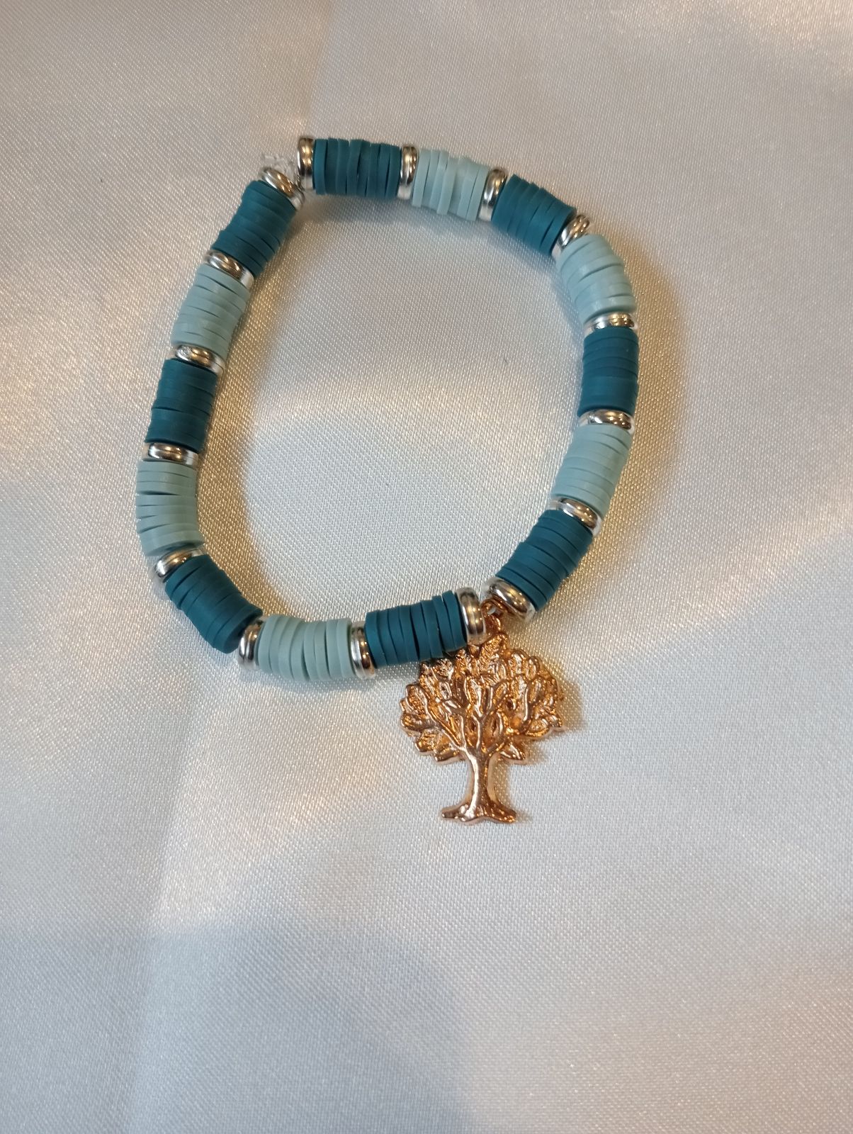 This is a handmade bracelet made of dark green teal and light teal beads separated by silver bead rings with a tree charm in the middle.