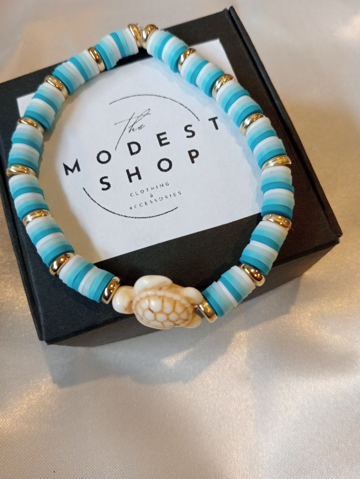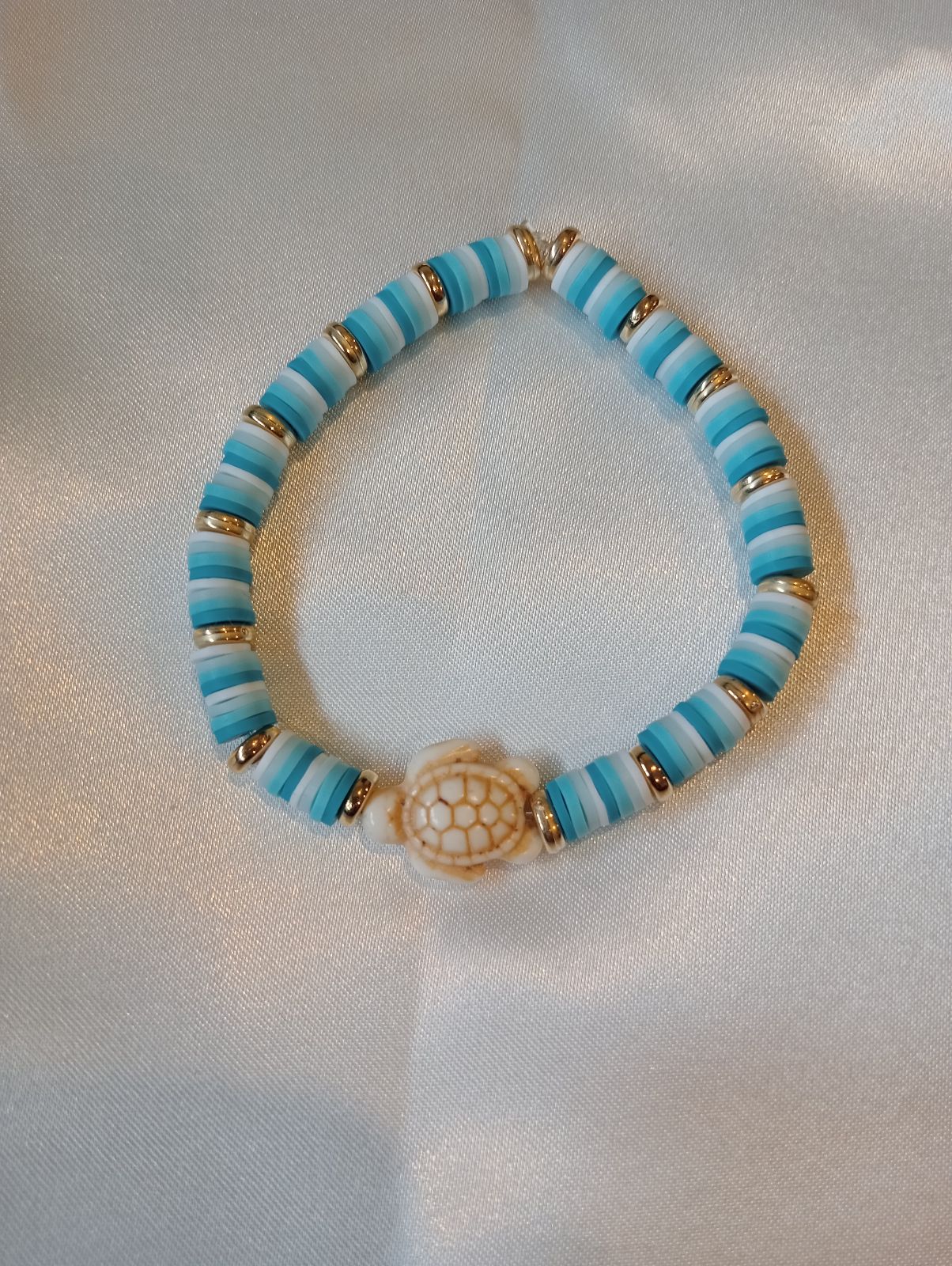 This is a handmade bracelet made of dark blue, blue, pastel blue and white beads separated by gold bead rings with a white turtle charm in the middle.